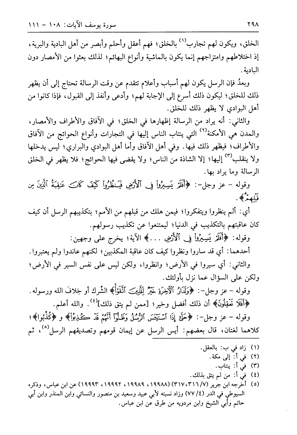والثاني: أنه يراد من الرسالة إظهارها في الخلق؛ في الآفاق والأطراف والأمصار، والمدن هي الأمكنة التي ينتاب الناس إليها في التجارات وأنواع الحوائج من الآفاق والأطراف؛ فيظهر ذلك فيها. وفي أهل الآفاق وأما أهل البوادي والبراري؛ ليس يدخلها ولا ينقلب إليها؛ إلا الشاذة من الناس؛ ولا يقضي فيها الحوائج؛ فلا يظهر في الخلق الرسالة وما يراد بها.