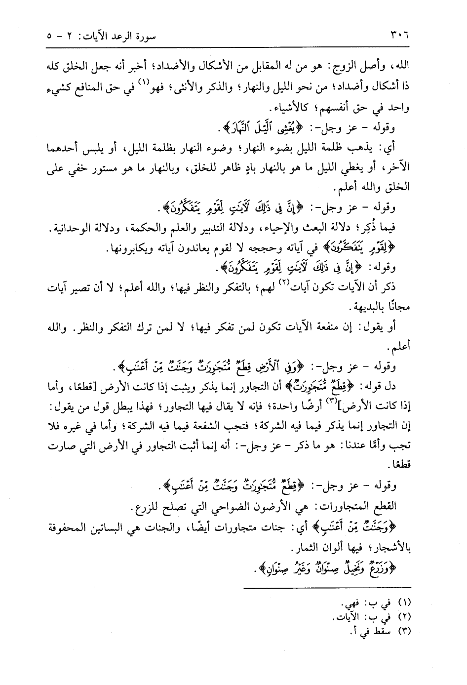 وقوله - عَزَّ وَجَلَّ -: (وَفِي الْأَرْضِ قِطَعٌ مُتَجَاوِرَاتٌ وَجَنَّاتٌ مِنْ أَعْنَابٍ وَزَرْعٌ وَنَخِيلٌ صِنْوَانٌ وَغَيْرُ صِنْوَانٍ يُسْقَى بِمَاءٍ وَاحِدٍ وَنُفَضِّلُ بَعْضَهَا عَلَى بَعْضٍ فِي الْأُكُلِ إِنَّ فِي ذَلِكَ لَآيَاتٍ لِقَوْمٍ يَعْقِلُونَ (4)