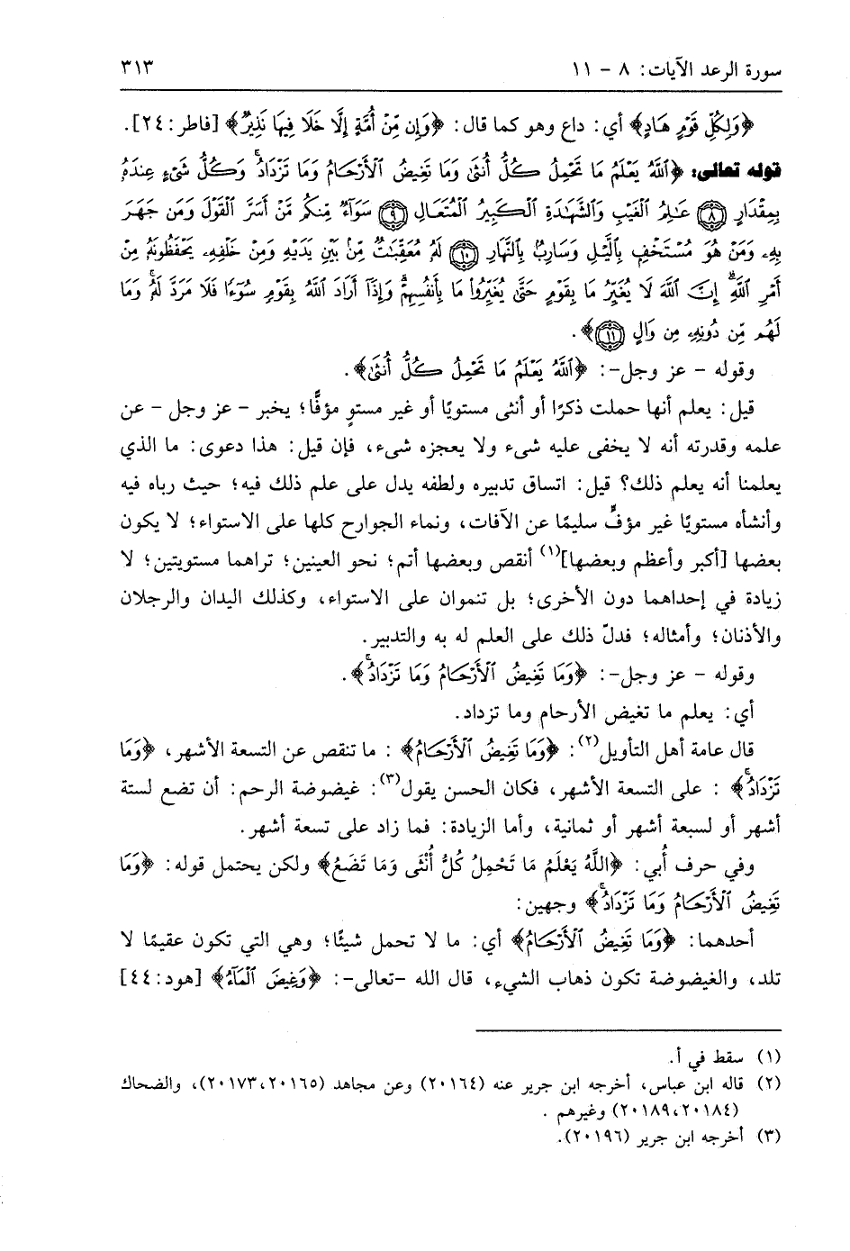 قال عامة أهل التأويل: (وَمَا تَغِيضُ الْأَرْحَامُ): ما تنقص عن التسعة الأشهر، (وَمَا تَزْدَادُ): على التسعة الأشهر، فكان الحسن يقول: غيضوضة الرحم: أن تضع لستة أشهر أو لسبعة أشهر أو ثمانية، وأما الزيادة: فما زاد على تسعة أشهر.