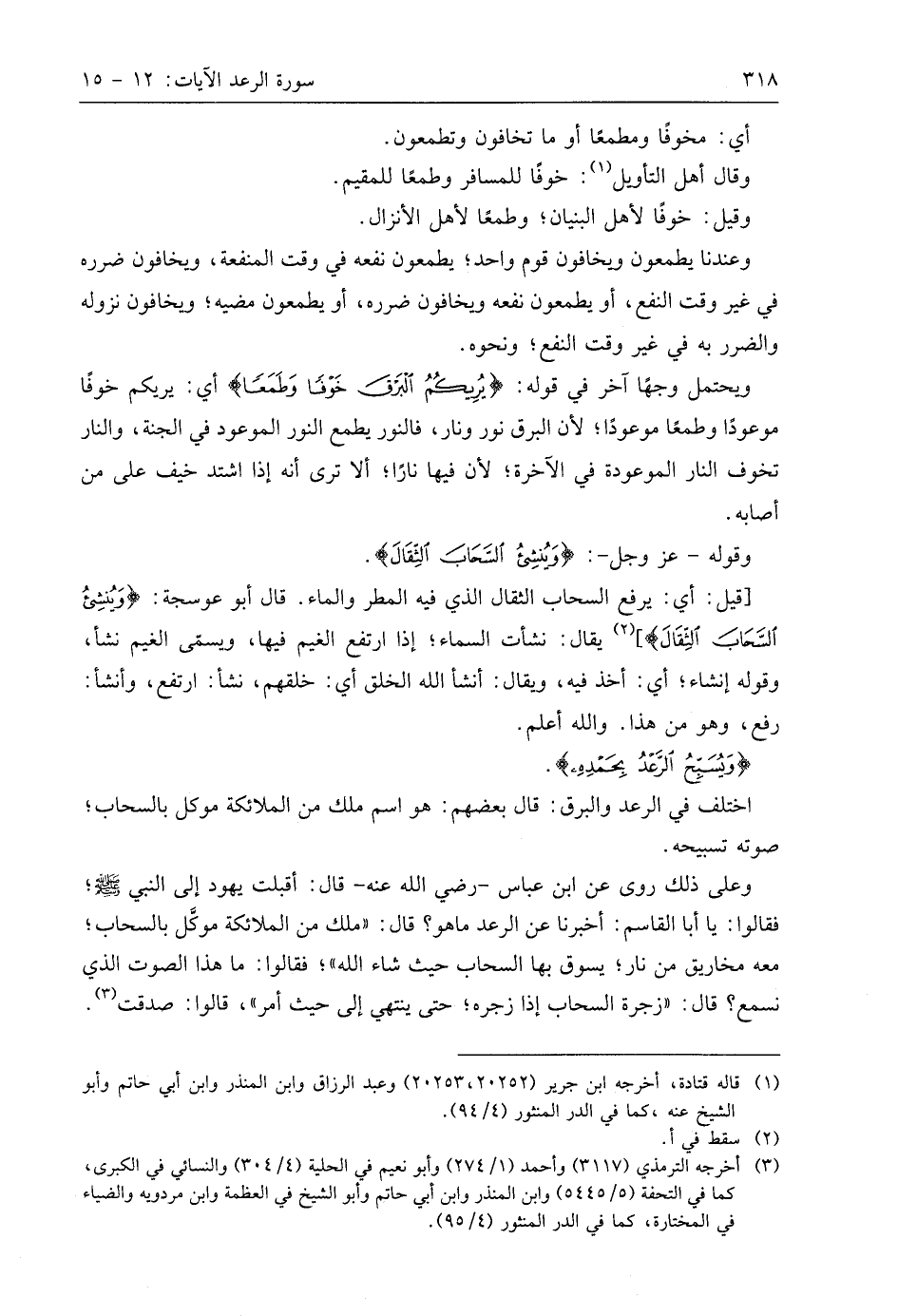 وعلى ذلك رُويَ عن ابن عَبَّاسٍ - رَضِيَ اللَّهُ عَنْهُ - قال: أقبلت يهود إلى النبي - صَلَّى اللَّهُ عَلَيهِ وَسَلَّمَ -؛ فقالوا: يا أبا القاسم: أخبرنا عن الرعد ما هو؟ قال: " ملك من الملائكة موكَّل بالسحاب؛ معه مخاريق من نار؛ يسوق بها السحاب حيث شاء اللَّه "؛ فقالوا: ما هذا الصوت الذي نسمع؟ قال: " زجرة السحاب إذا زجره؛ حتى ينتهي إلى حيث أمر "، قالوا: صدقت.