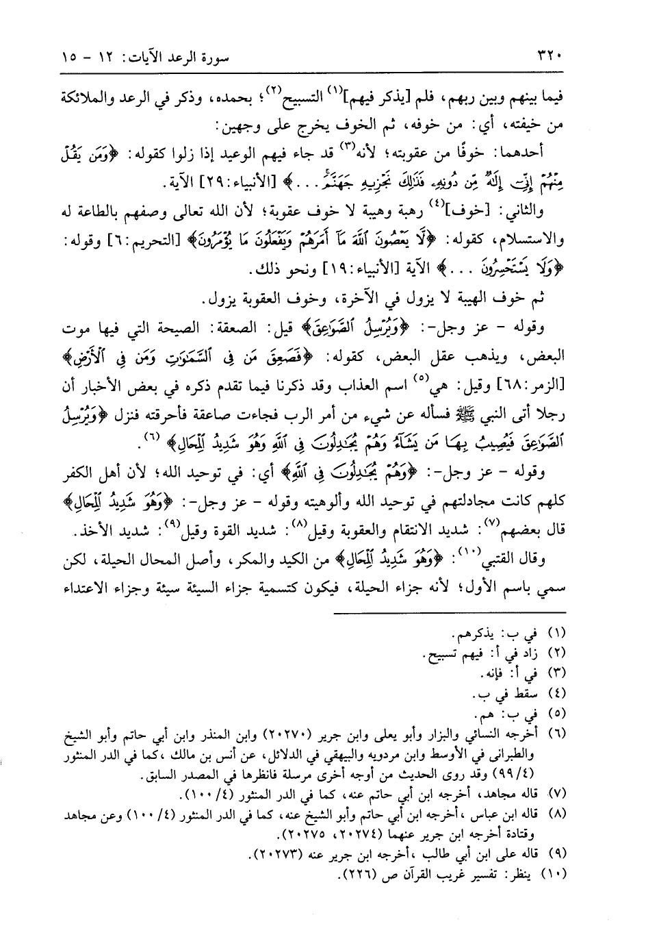 وقوله - عَزَّ وَجَلَّ -: (وَيُرْسِلُ الصَّوَاعِقَ) قيل: الصعقة: الصيحة التي فيها موت البعض، ويذهب عقل البعض، كقوله: (فَصَعِقَ مَنْ فِي السَّمَاوَاتِ وَمَنْ فِي الْأَرْضِ). وقيل: هي اسم العذاب وقد ذكرنا فيما تقدم ذكره في بعض الأخبار أن رجلا أتى النبي - صَلَّى اللَّهُ عَلَيهِ وَسَلَّمَ - فسأله عن شيء من أمر الرب فجاءت صاعقة فأحرقته فنزل (وَيُرْسِلُ الصَّوَاعِقَ فَيُصِيبُ بِهَا مَنْ يَشَاءُ وَهُمْ يُجَادِلُونَ فِي اللَّهِ وَهُوَ شَدِيدُ الْمِحَالِ).