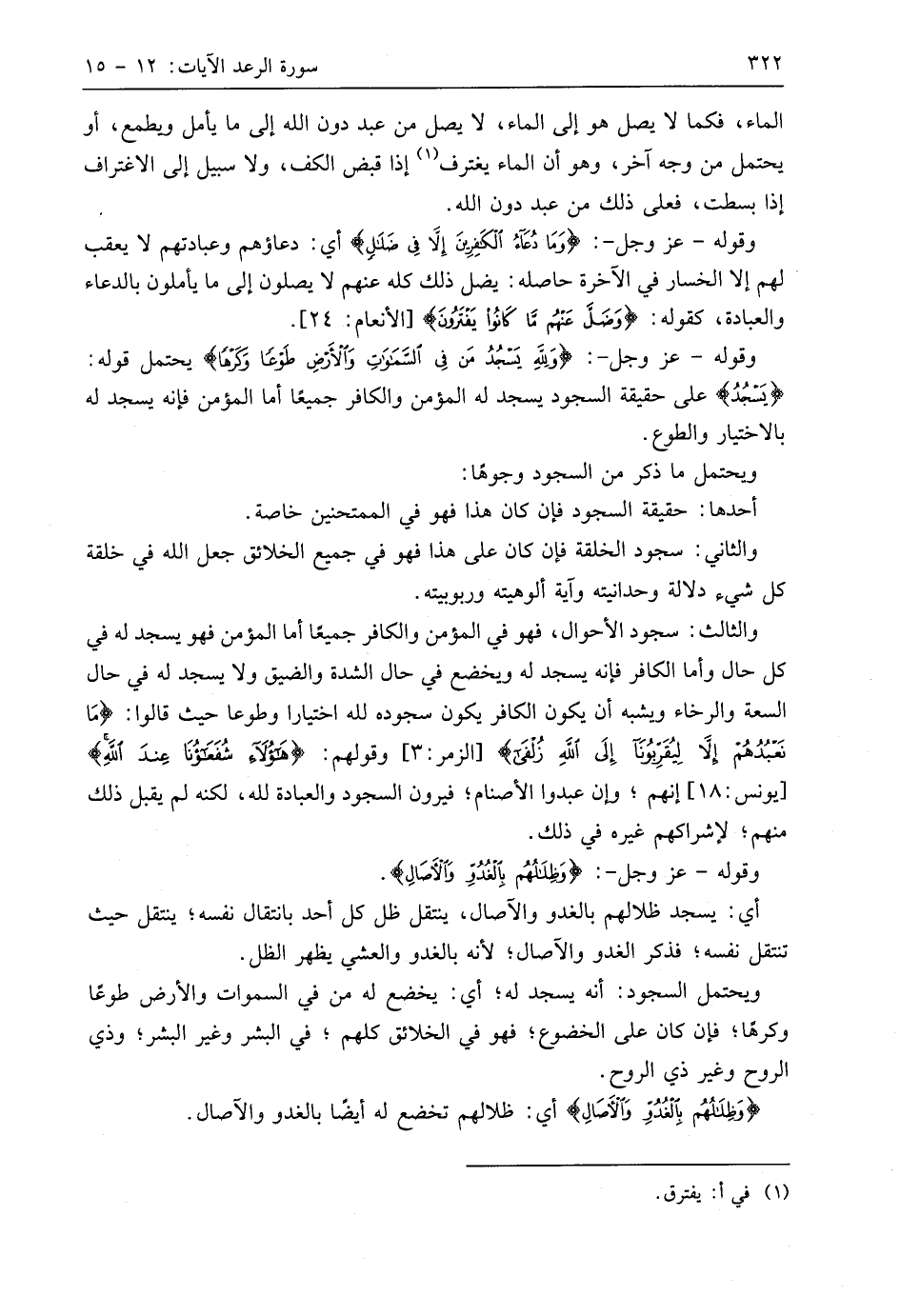 وقوله - عَزَّ وَجَلَّ -: (وَلِلَّهِ يَسْجُدُ مَنْ فِي السَّمَاوَاتِ وَالْأَرْضِ طَوْعًا وَكَرْهًا وَظِلَالُهُمْ بِالْغُدُوِّ وَالْآصَالِ (15) يحتمل قوله: (يسجُدُ) على حقيقة السجود يسجد له المؤمن والكافر جميعًا أما المؤمن فإنه يسجد له بالاختيار والطوع.