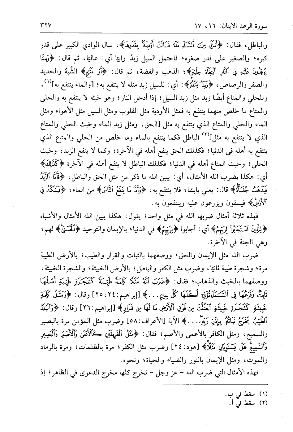 والباطل، فقال: (أَنْزَلَ مِنَ السَّمَاءِ مَاءً فَسَالَتْ أَوْدِيَةٌ بِقَدَرِهَا)، سالَ الوادي الكبير على قدر كبره؛ والصغير على قدر صغره؛ فاحتمل السيل زبدًا رابيًا أي: عاليًا، ثم قال: (وَمِمَّا يُوقِدُونَ عَلَيْهِ فِي النَّارِ ابْتِغَاءَ حِلْيَةٍ)؛ الذهب والفضة، ثم قال: (أَوْ مَتَاعٍ) الشَّبَهُ والحديد والصفر والرصاص، (زَبَدٌ مِثْلُهُ): أي: للسيل زبد مثله لا ينتفع به؛ أوالماء ينتفع به، وللحلي والمتاع أيضًا زبد مثل زبد السيل؛ إذا أدخل النار؛ وهو خبثه لا ينتفع به والحلى والمتاع ما خلص منهما ينتفع به فمثل الأودية مثل القلوب ومثل السيل مثل الأهواء ومثل الماء والحلي والمتاع الذي ينتفع به مثل الحق، ومثل زبد الماء وخبث الحلي والمتاع الذي لا ينتفع به مثل، الباطل فكما ينتفع بالماء وما خلص من الحلي والمتاع الذي ينتفع به أهله في الدنيا؛ فكذلك الحق ينفع أهله في الآخرة؛ وكما لا ينفع الزبد؛ وخبث الحلي؛ وخبث المتاع أهله في الدنيا؛ فكذلك الباطل لا ينفع أهله في الآخرة (كَذَلِكَ) أي: هكذا يضرب اللَّه الأمثال، أي: يبين اللَّه ما ذكر من مثل الحق والباطل، (فَأَمَّا الزَّبَدُ فَيَذْهَبُ جُفَاءً) قال: يعني يابسًا؛ فلا ينتفع به، (وَأَمَّا مَا يَنْفَعُ النَّاسَ) من الماء؛ (فَيَمْكُثُ فِي الْأَرْضِ) فيسقون ويزرعون عليه وينتفعون به.