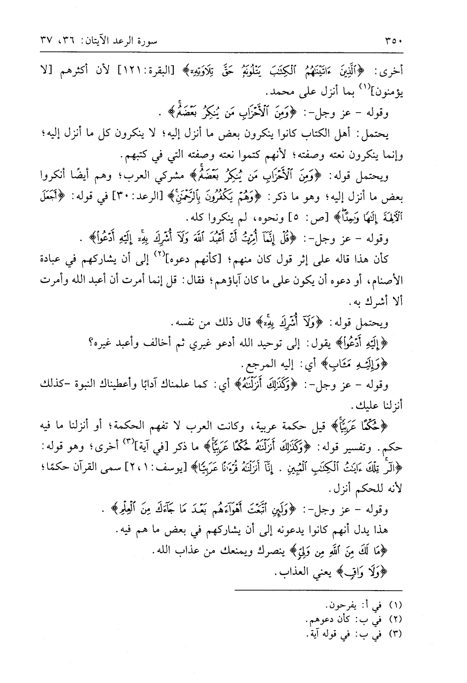ويحتمل قوله: (وَمِنَ الْأَحْزَابِ مَنْ يُنْكِرُ بَعْضَهُ) مشركي العرب؛ وهم أيضًا أنكروا بعض ما أنزل إليه؛ وهو ما ذكر: (وَهُمْ يَكْفُرُونَ بِالرَّحْمَنِ)، في قوله: (أَجَعَلَ الْآلِهَةَ إِلَهًا وَاحِدًا)، ونحوه، لم ينكروا كله.