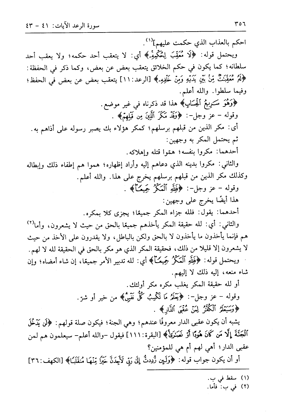 ْويحتمل قوله: (فَلِلَّهِ الْمَكْرُ جَمِيعًا) أي: لله تدبير الأمر جميعًا، إن شاء أمضاه؛ وإن شاء منعه، إليه ذلك لا إليهم.