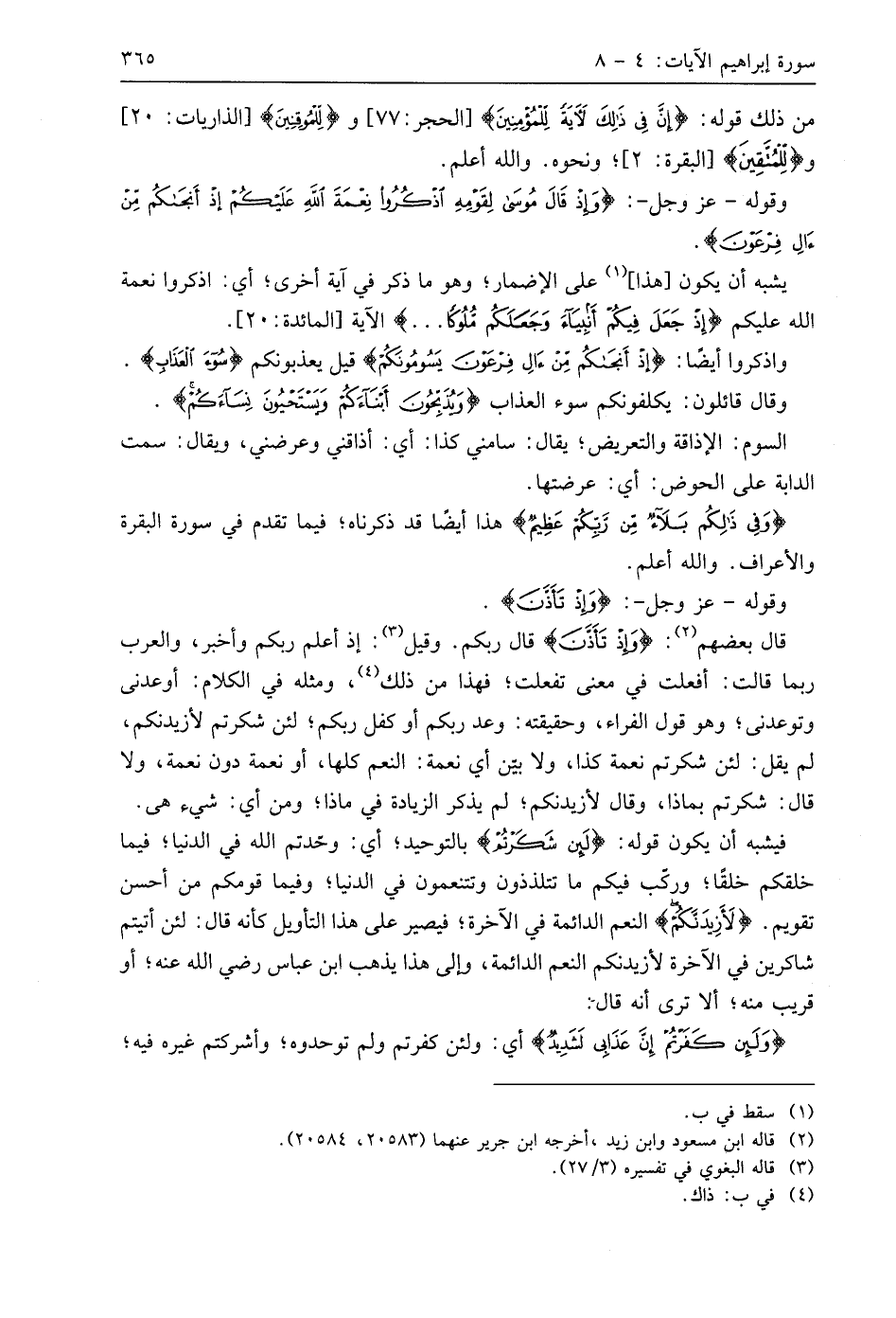 وقوله - عَزَّ وَجَلَّ -: (وَإِذْ تَأَذَّنَ رَبُّكُمْ لَئِنْ شَكَرْتُمْ لَأَزِيدَنَّكُمْ وَلَئِنْ كَفَرْتُمْ إِنَّ عَذَابِي لَشَدِيدٌ (7)