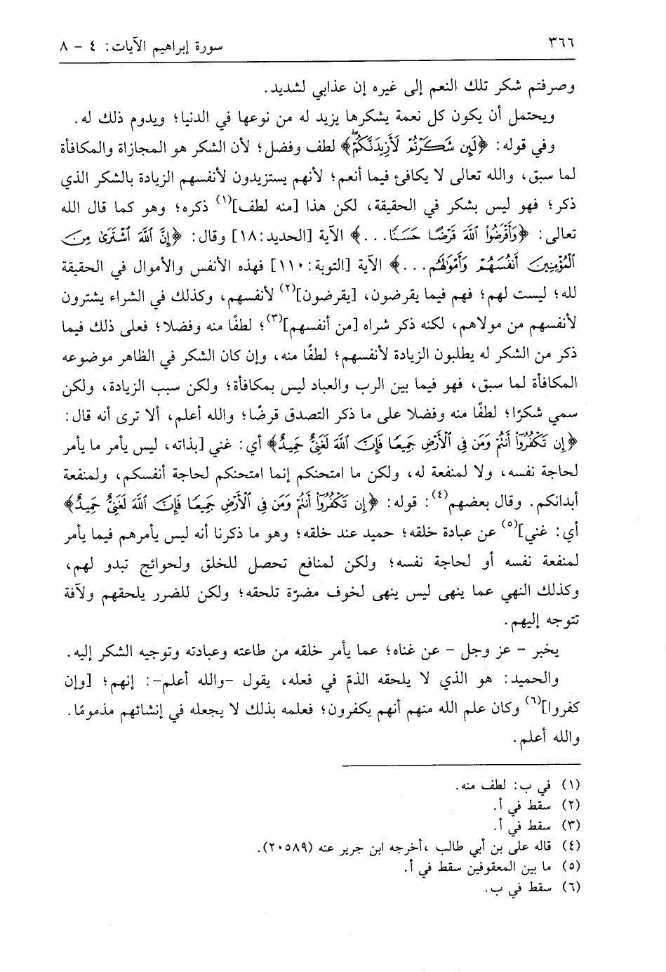 وفي قوله: (لَئِنْ شَكَرْتُمْ لَأَزِيدَنَّكُمْ) لطف وفضل؛ لأن الشكر هو المجازاة والمكافأة لما سبق، واللَّه تعالى لا يكافئ فيما أنعم؛ لأنهم يستزيدون لأنفسهم الزيادة بالشكر الذي ذكر؛ فهو ليس بشكر في الحقيقة، لكن هذا منه لطف، ذكره؛ وهو كما قال الله تعالى: (وَأَقْرِضُوا اللَّهَ قَرْضًا حَسَنًا. . .) الآية، وقال: (إِنَّ اللَّهَ اشْتَرَى مِنَ الْمُؤْمِنِينَ أَنْفُسَهُمْ وَأَمْوَالَهُمْ. . .) الآية، فهذه الأنفس والأموال في الحقيقة لله؛ ليست لهم؛ فهم فيما يقرضون، يقرضون لأنفسهم، وكذلك في الشراء يشترون لأنفسهم من مولاهم، لكنه ذكر شراه من أنفسهم؛ لطفًا منه وفضلا؛ فعلى ذلك فيما ذكر من الشكر له يطلبون الزيادة لأنفسهم؛ لطفًا منه، وإن كان الشكر في الظاهر موضوعه المكافأة لما سبق، فهو فيما بين الرب والعباد ليس بمكافأة؛ ولكن سبب الزيادة، ولكن سمي شكرًا؛ لطفًا منه وفضلا على ما ذكر التصدق قرضًا؛ واللَّه أعلم، ألا ترى أنه قال: (إِنْ تَكْفُرُوا أَنْتُمْ وَمَنْ فِي الْأَرْضِ جَمِيعًا فَإِنَّ اللَّهَ لَغَنِيٌّ حَمِيدٌ (8) أي: غني بذاته، ليس يأمر ما يأمر لحاجة نفسه، ولا لمنفعة له، ولكن ما امتحنكم إنما امتحنكم لحاجة أنفسكم، ولمنفعة أبدانكم. وقَالَ بَعْضُهُمْ: قوله: (إِنْ تَكْفُرُوا أَنْتُمْ وَمَنْ فِي الْأَرْضِ جَمِيعًا فَإِنَّ اللَّهَ لَغَنِيٌّ حَمِيدٌ) أي: غني، عن عبادة خلقه؛ حميد عند خلقه؛ وهو ما ذكرنا أنه ليس يأمرهم فيما يأمر لمنفعة نفسه أو لحاجة نفسه؛ ولكن لمنافع تحصل للخلق ولحوائج تبدو لهم، وكذلك النهي عما ينهى ليس ينهى لخوف مضرّة تلحقه؛ ولكن للضرر يلحقهم ولآفة تتوجه إليهم.