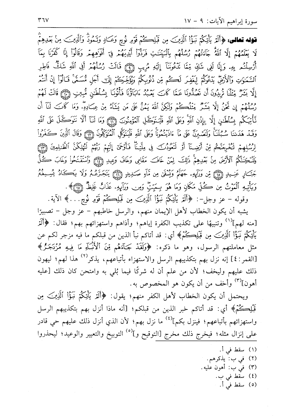 قوله تعالى: (أَلَمْ يَأْتِكُمْ نَبَأُ الَّذِينَ مِنْ قَبْلِكُمْ قَوْمِ نُوحٍ وَعَادٍ وَثَمُودَ وَالَّذِينَ مِنْ بَعْدِهِمْ لَا يَعْلَمُهُمْ إِلَّا اللَّهُ جَاءَتْهُمْ رُسُلُهُمْ بِالْبَيِّنَاتِ فَرَدُّوا أَيْدِيَهُمْ فِي أَفْوَاهِهِمْ وَقَالُوا إِنَّا كَفَرْنَا بِمَا أُرْسِلْتُمْ بِهِ وَإِنَّا لَفِي شَكٍّ مِمَّا تَدْعُونَنَا إِلَيْهِ مُرِيبٍ (9) قَالَتْ رُسُلُهُمْ أَفِي اللَّهِ شَكٌّ فَاطِرِ السَّمَاوَاتِ وَالْأَرْضِ يَدْعُوكُمْ لِيَغْفِرَ لَكُمْ مِنْ ذُنُوبِكُمْ وَيُؤَخِّرَكُمْ إِلَى أَجَلٍ مُسَمًّى قَالُوا إِنْ أَنْتُمْ إِلَّا بَشَرٌ مِثْلُنَا تُرِيدُونَ أَنْ تَصُدُّونَا عَمَّا كَانَ يَعْبُدُ آبَاؤُنَا فَأْتُونَا بِسُلْطَانٍ مُبِينٍ (10) قَالَتْ لَهُمْ رُسُلُهُمْ إِنْ نَحْنُ إِلَّا بَشَرٌ مِثْلُكُمْ وَلَكِنَّ اللَّهَ يَمُنُّ عَلَى مَنْ يَشَاءُ مِنْ عِبَادِهِ وَمَا كَانَ لَنَا أَنْ نَأْتِيَكُمْ بِسُلْطَانٍ إِلَّا بِإِذْنِ اللَّهِ وَعَلَى اللَّهِ فَلْيَتَوَكَّلِ الْمُؤْمِنُونَ (11) وَمَا لَنَا أَلَّا نَتَوَكَّلَ عَلَى اللَّهِ وَقَدْ هَدَانَا سُبُلَنَا وَلَنَصْبِرَنَّ عَلَى مَا آذَيْتُمُونَا وَعَلَى اللَّهِ فَلْيَتَوَكَّلِ الْمُتَوَكِّلُونَ (12) وَقَالَ الَّذِينَ كَفَرُوا لِرُسُلِهِمْ لَنُخْرِجَنَّكُمْ مِنْ أَرْضِنَا أَوْ لَتَعُودُنَّ فِي مِلَّتِنَا فَأَوْحَى إِلَيْهِمْ رَبُّهُمْ لَنُهْلِكَنَّ الظَّالِمِينَ (13) وَلَنُسْكِنَنَّكُمُ الْأَرْضَ مِنْ بَعْدِهِمْ ذَلِكَ لِمَنْ خَافَ مَقَامِي وَخَافَ وَعِيدِ (14) وَاسْتَفْتَحُوا وَخَابَ كُلُّ جَبَّارٍ عَنِيدٍ (15) مِنْ وَرَائِهِ جَهَنَّمُ وَيُسْقَى مِنْ مَاءٍ صَدِيدٍ (16) يَتَجَرَّعُهُ وَلَا يَكَادُ يُسِيغُهُ وَيَأْتِيهِ الْمَوْتُ مِنْ كُلِّ مَكَانٍ وَمَا هُوَ بِمَيِّتٍ وَمِنْ وَرَائِهِ عَذَابٌ غَلِيظٌ (17)