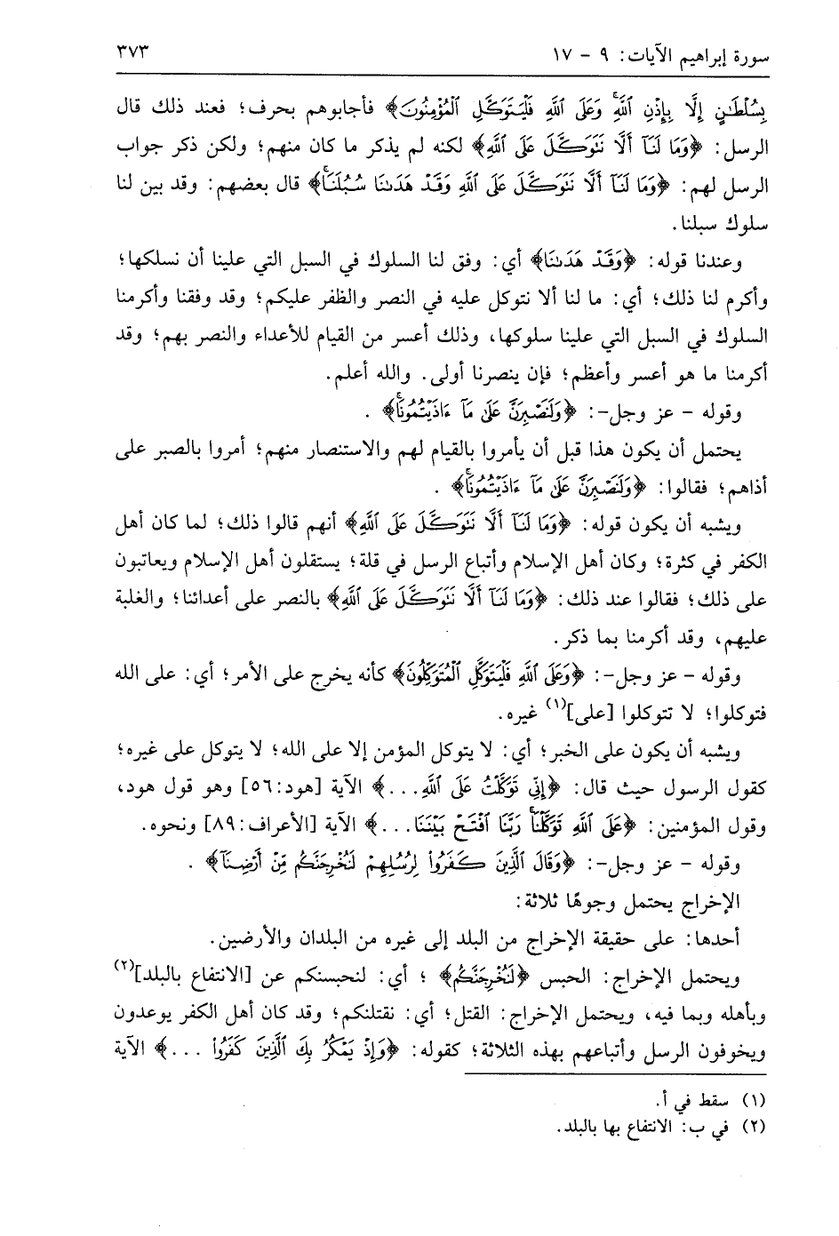 بِسُلْطَانٍ إِلَّا بِإِذْنِ اللَّهِ وَعَلَى اللَّهِ فَلْيَتَوَكَّلِ الْمُؤْمِنُونَ) فأجابوهم بحرف؛ فعند ذلك قال الرسل: (وَمَا لَنَا أَلَّا نَتَوَكَّلَ عَلَى اللَّهِ) لكنه لم يذكر ما كان منهم؛ ولكن ذكر جواب الرسل لهم: (وَمَا لَنَا أَلَّا نَتَوَكَّلَ عَلَى اللَّهِ وَقَدْ هَدَانَا سُبُلَنَا) قَالَ بَعْضُهُمْ: وقد بين لنا سلوك سبلنا.