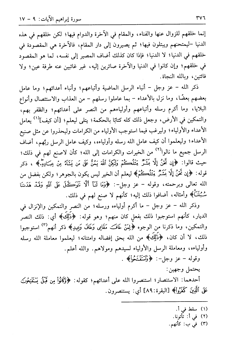ذكر اللَّه - عَزَّ وَجَلَّ - أنباء الرسل الماضية وأتباعهم؛ وأنباء أعدائهم؛ وما عامل بعضهم بعضًا، وما نزل بالأعداء - بما عاملوا رسلهم - من العذاب والاستئصال وأنواع البلايا، وما أكرم رسله وأتباعهم وأولياءهم من النصر على أعدائهم؛ والظفر بهم، والتمكين في الأرض، وجعل ذلك كله كتابًا بالحكمة؛ يتلى ليعلم؛ أن كيف يعامل الأعداء والأولياء؛ وليرغب فيما استوجب الأولياء من الكرامات وليحذروا عن مثل صنيع الأعداء؛ وليعلموا أن كيف عامل اللَّه رسله وأولياءه، وكيف عامل الرسل ربهم، أضاف الرسل جميع ما نالوا من الخيرات والكرامات إلى اللَّه؛ كأن لا صنع لهم في ذلك؛ حيث قالوا: (إِنْ نَحْنُ إِلَّا بَشَرٌ مِثْلُكُمْ وَلَكِنَّ اللَّهَ يَمُنُّ عَلَى مَنْ يَشَاءُ مِنْ عِبَادِهِ)، ذكر قوله: (إِنْ نَحْنُ إِلَّا بَشَرٌ مِثْلُكُمْ) ليعلم أن الخير ليس يكون بالجوهر؛ ولكن بفضل من اللَّه تعالى وبرحمته، وقوله - عَزَّ وَجَلَّ -: (وَمَا لَنَا أَلَّا نَتَوَكَّلَ عَلَى اللَّهِ وَقَدْ هَدَانَا سُبُلَنَا) وأمثاله، أضافوا ذلك إليه؛ كأنهم لا صنع لهم في ذلك.