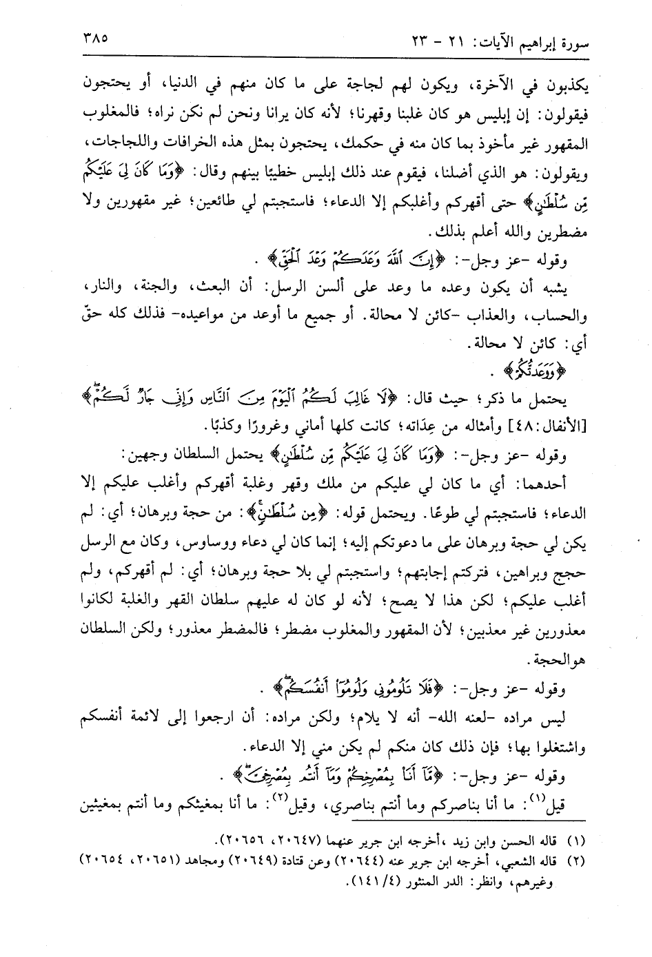 وقوله - عَزَّ وَجَلَّ -: (مَا أَنَا بِمُصْرِخِكُمْ وَمَا أَنْتُمْ بِمُصْرِخِيَّ).
