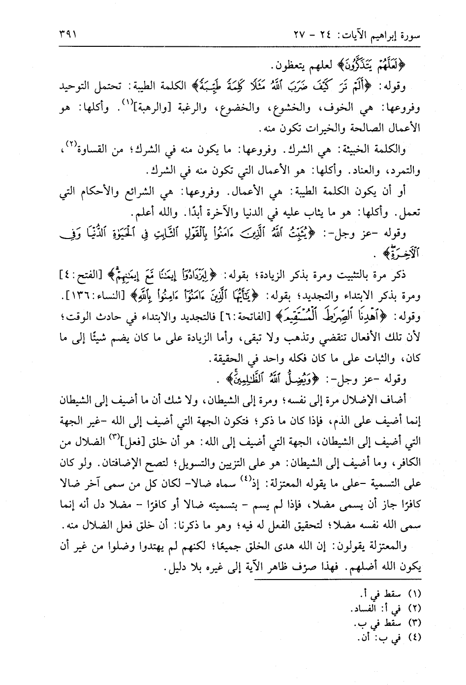 أضاف الإضلال مرة إلى نفسه؛ ومرة إلى الشيطان، ولا شك أن ما أضيف إلى الشيطان إنما أضيف على الذم، فإذا كان ما ذكر؛ فتكون الجهة التي أضيف إلى اللَّه - غير الجهة التي أضيف إلى الشيطان، الجهة التي أضيف إلى اللَّه: هو أن خلق فعل الضلال من الكافر، وما أضيف إلى الشيطان: هو على التزيين والتسويل؛ لتصح الإضافتان. ولو كان على التسمية - على ما يقوله المعتزلة: إذ سماه ضالا - لكان كل من سمى آخر ضالا كافرًا جاز أن يسمى مضلا، فإذا لم يسم - بتسميته ضالا أو كافرًا - مضلا دل أنه إنما سمى اللَّه نفسه مضلا؛ لتحقيق الفعل له فيه؛ وهو ما ذكرنا: أن خلق فعل الضلال منه.