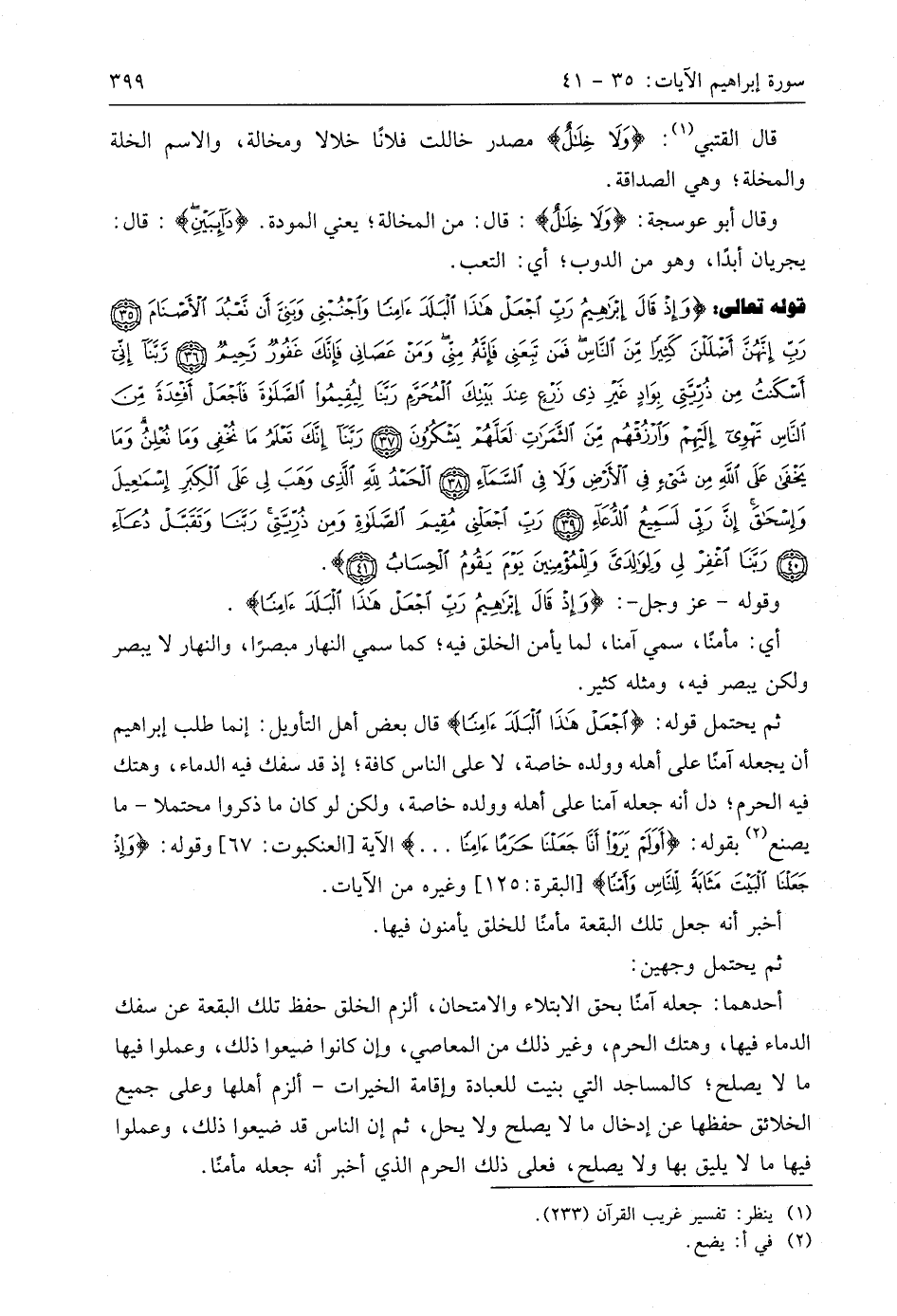 قوله تعالى: (وَإِذْ قَالَ إِبْرَاهِيمُ رَبِّ اجْعَلْ هَذَا الْبَلَدَ آمِنًا وَاجْنُبْنِي وَبَنِيَّ أَنْ نَعْبُدَ الْأَصْنَامَ (35) رَبِّ إِنَّهُنَّ أَضْلَلْنَ كَثِيرًا مِنَ النَّاسِ فَمَنْ تَبِعَنِي فَإِنَّهُ مِنِّي وَمَنْ عَصَانِي فَإِنَّكَ غَفُورٌ رَحِيمٌ (36) رَبَّنَا إِنِّي أَسْكَنْتُ مِنْ ذُرِّيَّتِي بِوَادٍ غَيْرِ ذِي زَرْعٍ عِنْدَ بَيْتِكَ الْمُحَرَّمِ رَبَّنَا لِيُقِيمُوا الصَّلَاةَ فَاجْعَلْ أَفْئِدَةً مِنَ النَّاسِ تَهْوِي إِلَيْهِمْ وَارْزُقْهُمْ مِنَ الثَّمَرَاتِ لَعَلَّهُمْ يَشْكُرُونَ (37) رَبَّنَا إِنَّكَ تَعْلَمُ مَا نُخْفِي وَمَا نُعْلِنُ وَمَا يَخْفَى عَلَى اللَّهِ مِنْ شَيْءٍ فِي الْأَرْضِ وَلَا فِي السَّمَاءِ (38) الْحَمْدُ لِلَّهِ الَّذِي وَهَبَ لِي عَلَى الْكِبَرِ إِسْمَاعِيلَ وَإِسْحَاقَ إِنَّ رَبِّي لَسَمِيعُ الدُّعَاءِ (39) رَبِّ اجْعَلْنِي مُقِيمَ الصَّلَاةِ وَمِنْ ذُرِّيَّتِي رَبَّنَا وَتَقَبَّلْ دُعَاءِ (40) رَبَّنَا اغْفِرْ لِي وَلِوَالِدَيَّ وَلِلْمُؤْمِنِينَ يَوْمَ يَقُومُ الْحِسَابُ (41)