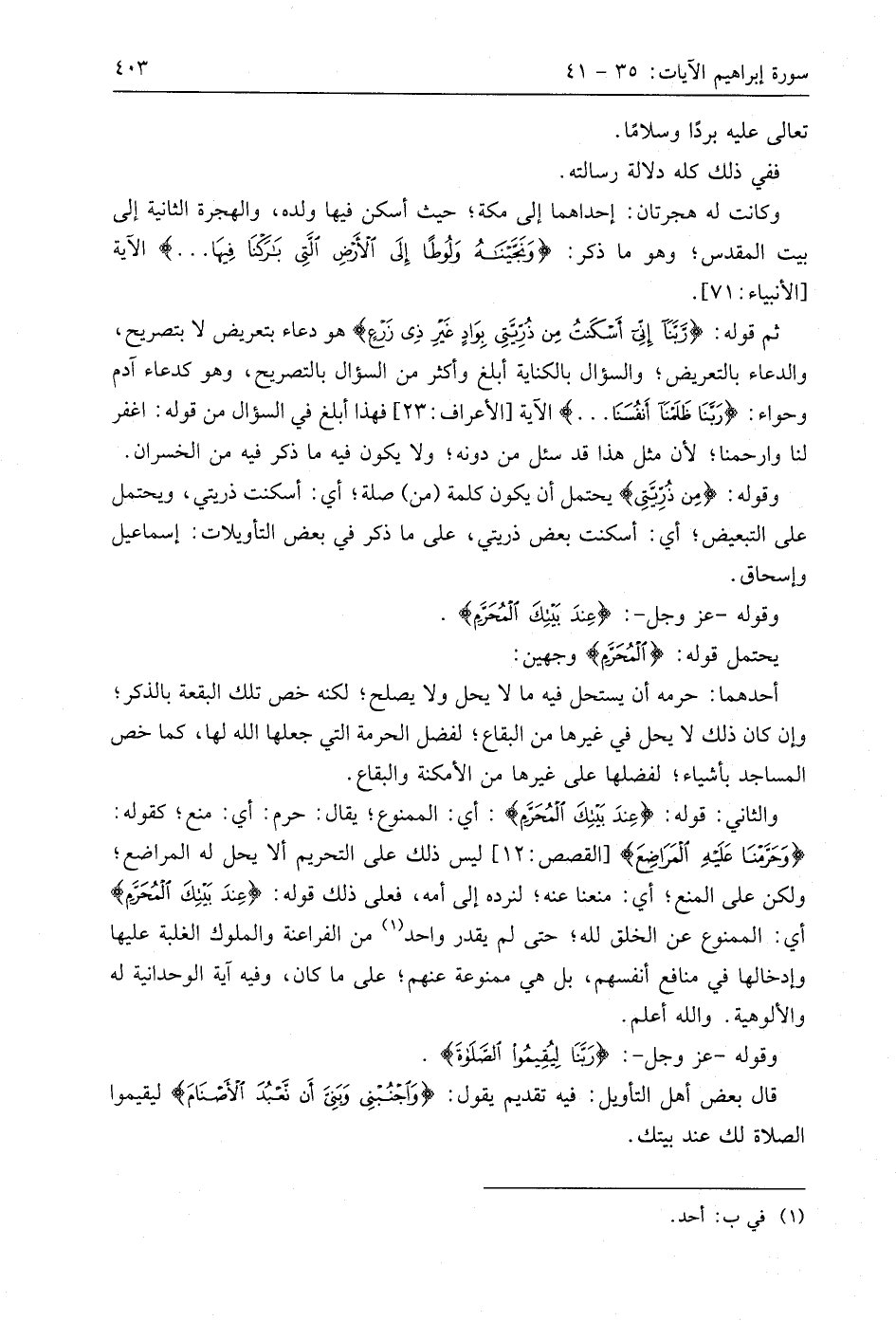 وقوله: (مِنْ ذُرِّيَّتِي) يحتمل أن يكون كلمة (من) صلة؛ أي: أسكنت ذريتي، ويحتمل على التبعيض؛ أي: أسكنت بعض ذريتي، على ما ذكر في بعض التأويلات: إسماعيل وإسحاق.