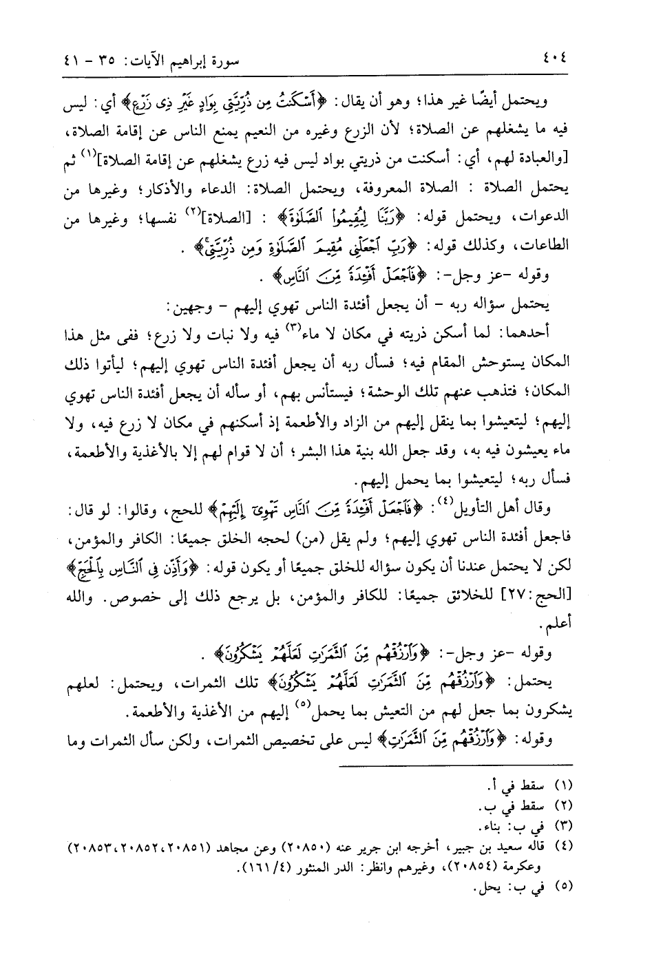 ويحتمل أيضًا غير هذا؛ وهو أن يقال: (أَسْكَنْتُ مِنْ ذُرِّيَّتِي بِوَادٍ غَيْرِ ذِي زَرْعٍ) أي: ليس فيه ما يشغلهم عن الصلاة؛ لأن الزرع وغيره من النعيم يمنع الناس عن إقامة الصلاة، والعبادة لهم، أي: أسكنت من ذريتي بواد ليس فيه زرع يشغلهم عن إقامة الصلاة، ثم يحتمل الصلاة: الصلاة المعروفة، ويحتمل الصلاة: الدعاء والأذكار؛ وغيرها من الدعوات، ويحتمل قوله: (رَبَّنَا لِيُقِيمُوا الصَّلَاةَ): الصلاة، نفسها؛ وغيرها من الطاعات، وكذلك قوله: (رَبِّ اجْعَلْنِي مُقِيمَ الصَّلَاةِ وَمِنْ ذُرِّيَّتِي).