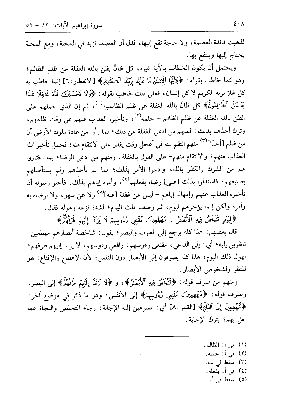 ومنهم من صرف قوله: (تَشْخَصُ فِيهِ الْأَبْصَارُ)، و (لَا يَرْتَدُّ إِلَيْهِمْ طَرْفُهُمْ) إلى البصر، وصرف قوله: (مُهْطِعِينَ مُقْنِعِي رُءُوسِهِمْ) إلى الأنفس؛ وهو ما ذكر في موضع آخر: (مُهْطِعِينَ إِلَى الدَّاعِ)، أي: مسرعين إليه الإجابة؛ رجاء التخلص والنجاة عما حل بهم؛ بترك الإجابة.