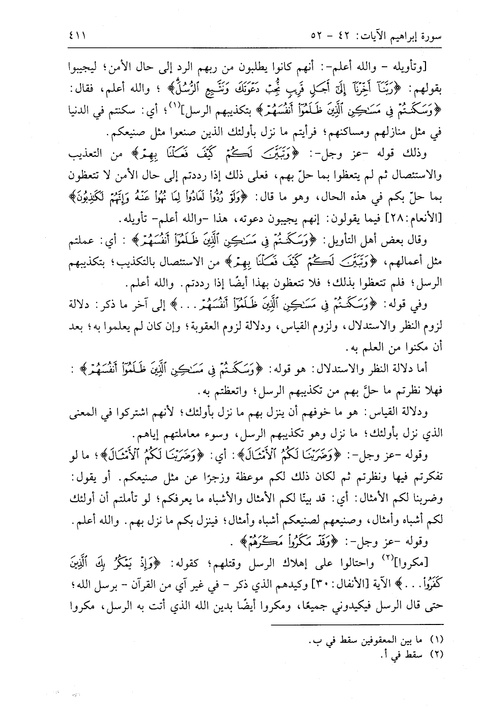 وتأويله - واللَّه أعلم -: أنهم كانوا يطلبون من ربهم الرد إلى حال الأمن؛ ليجيبوا بقولهم: (رَبَّنَا أَخِّرْنَا إِلَى أَجَلٍ قَرِيبٍ نُجِبْ دَعْوَتَكَ وَنَتَّبِعِ الرُّسُلَ)؛ واللَّه أعلم، فقال: (وَسَكَنْتُمْ فِي مَسَاكِنِ الَّذِينَ ظَلَمُوا أَنْفُسَهُمْ) بتكذيبهم الرسل أي: سكنتم في الدنيا في مثل منازلهم ومساكنهم؛ فرأيتم ما نزل بأُولَئِكَ الذين صنعوا مثل صنيعكم.