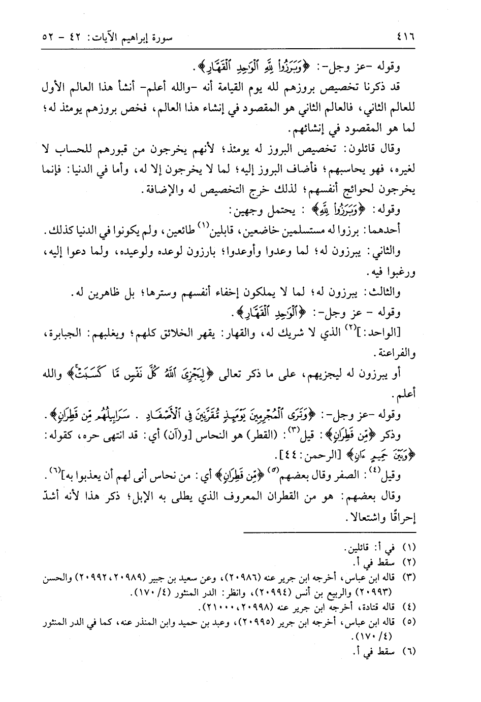 وقوله - عَزَّ وَجَلَّ -: (وَتَرَى الْمُجْرِمِينَ يَوْمَئِذٍ مُقَرَّنِينَ فِي الْأَصْفَادِ (49) سَرَابِيلُهُمْ مِنْ قَطِرَانٍ) وذكر (مِنْ قَطِرَانٍ): قيل: (القطر) هو النحاس أو (آنٍ) أي: قد انتهى حره، كقوله: (وَبَيْنَ حَمِيمٍ آنٍ).