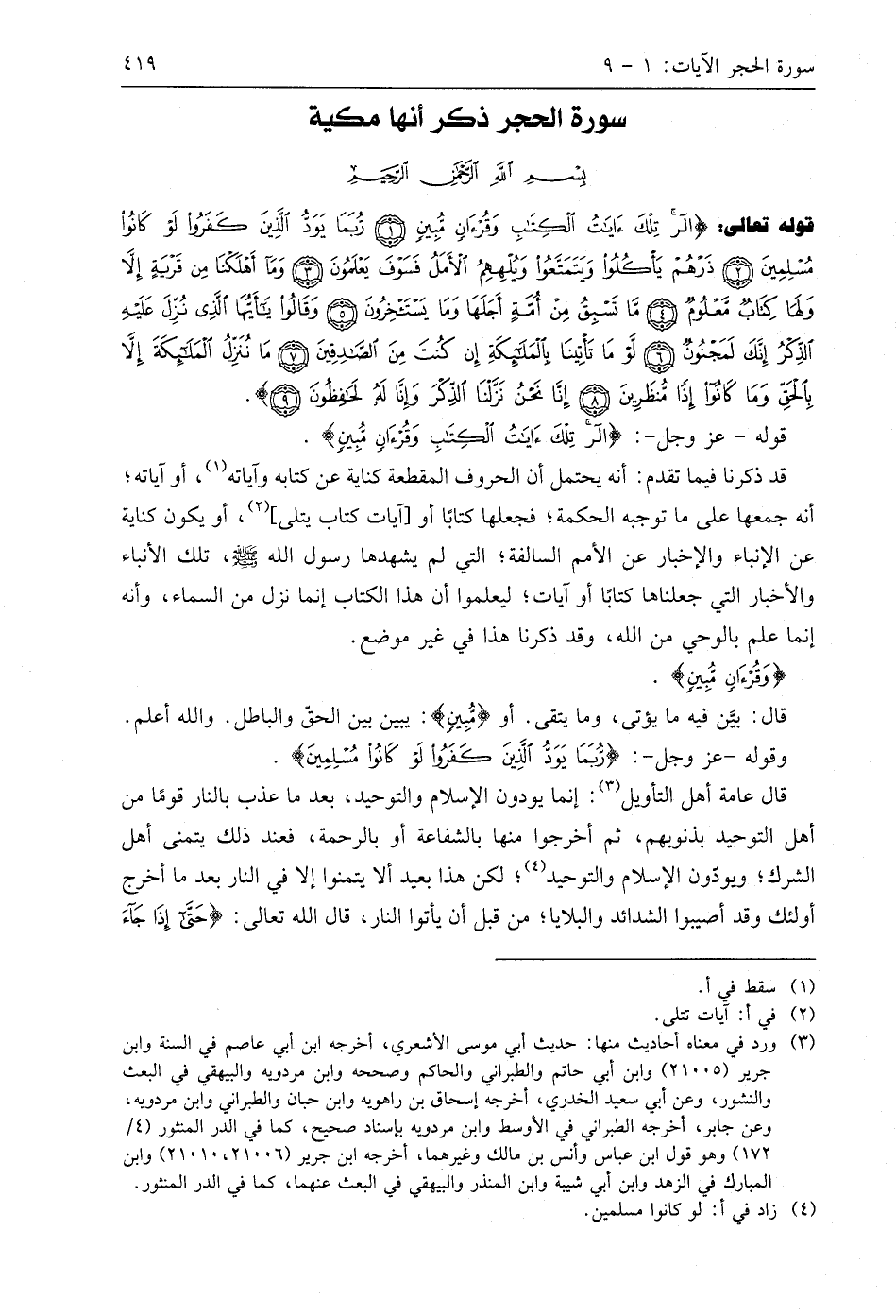 قوله تعالى: (الر تِلْكَ آيَاتُ الْكِتَابِ وَقُرْآنٍ مُبِينٍ (1) رُبَمَا يَوَدُّ الَّذِينَ كَفَرُوا لَوْ كَانُوا مُسْلِمِينَ (2) ذَرْهُمْ يَأْكُلُوا وَيَتَمَتَّعُوا وَيُلْهِهِمُ الْأَمَلُ فَسَوْفَ يَعْلَمُونَ (3) وَمَا أَهْلَكْنَا مِنْ قَرْيَةٍ إِلَّا وَلَهَا كِتَابٌ مَعْلُومٌ (4) مَا تَسْبِقُ مِنْ أُمَّةٍ أَجَلَهَا وَمَا يَسْتَأْخِرُونَ (5) وَقَالُوا يَا أَيُّهَا الَّذِي نُزِّلَ عَلَيْهِ الذِّكْرُ إِنَّكَ لَمَجْنُونٌ (6) لَوْ مَا تَأْتِينَا بِالْمَلَائِكَةِ إِنْ كُنْتَ مِنَ الصَّادِقِينَ (7) مَا نُنَزِّلُ الْمَلَائِكَةَ إِلَّا بِالْحَقِّ وَمَا كَانُوا إِذًا مُنْظَرِينَ (8) إِنَّا نَحْنُ نَزَّلْنَا الذِّكْرَ وَإِنَّا لَهُ لَحَافِظُونَ (9)