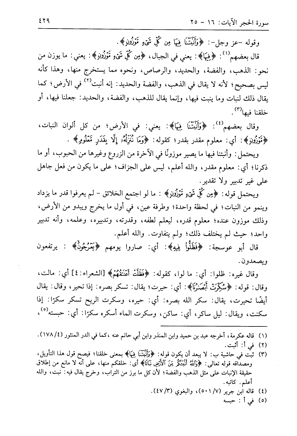 قَالَ بَعْضُهُمْ: (فِيهَا): يعني في الجبال، (مِنْ كُلِّ شَيْءٍ مَوْزُونٍ): يعني: ما يوزن من نحو: الذهب، والفضة، والحديد، والرصاص، ونحوه مما يستخرج منها، وهذا كأنه ليس بصحيح؛ لأنه لا يقال في الذهب، والفضة والحديد: إنه أنبت في الأرض؛ كما يقال ذلك لنبات وما ينبت فيها، وإنما يقال للذهب، والفضة، والحديد: جعلنا فيها، أو خلقنا فيها.