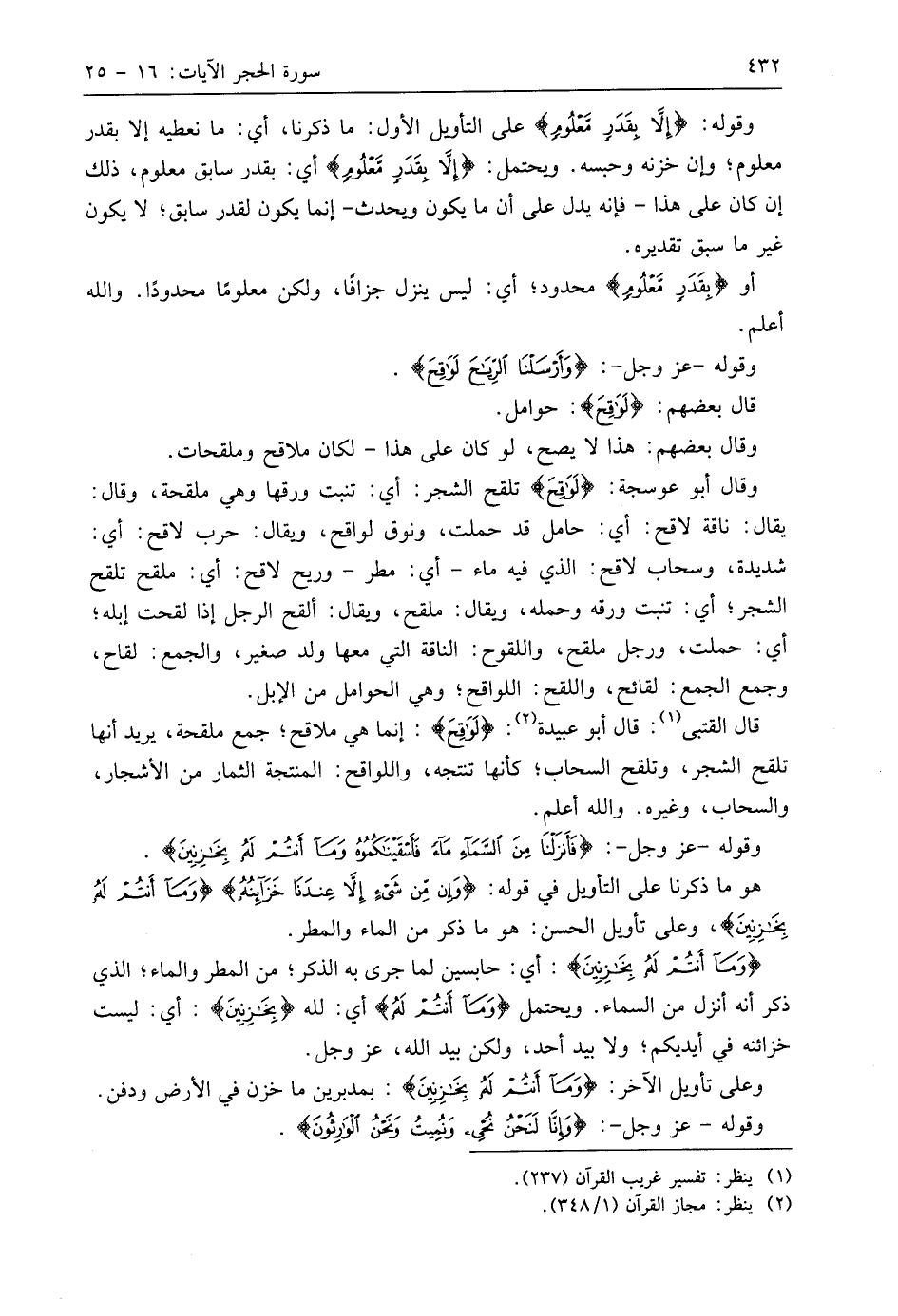 قَالَ الْقُتَبِيُّ: قال أبو عبيدة: (لَوَاقِحَ): إنما هي ملاقح؛ جمع ملقحة، يريد أنها تلقح الشجر، وتلقح السحاب؛ كأنها تنتجه، واللواقح: المنتجة الثمار من الأشجار، والسحاب، وغيره. واللَّه أعلم.