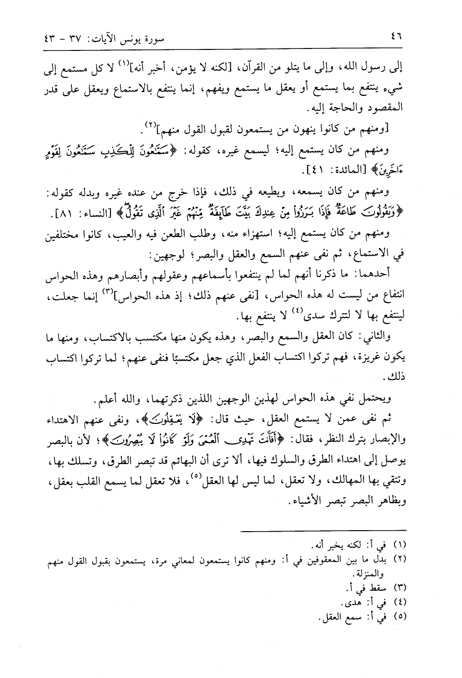ثم نفى عمن لا يستمع العقل، حيث قال: (لَا يَعْقِلُونَ)، ونفى عنهم الاهتداء والإبصار بترك النظر، فقال: (أَفَأَنْتَ تَهْدِي الْعُمْيَ وَلَوْ كَانُوا لَا يُبْصِرُونَ (43) لأن بالبصر يوصل إلى اهتداء الطرق والسلوك فيها، ألا ترى أن البهائم قد تبصر الطرق، وتسلك بها، وتتقي بها المهالك، ولا تعقل، لما ليس لها العقل، فلا تعقل لما يسمع القلب بعقل، وبظاهر البصر تبصر الأشياء.
