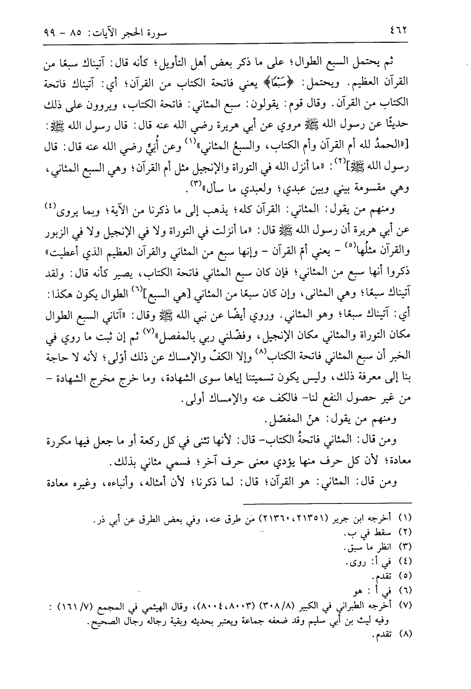 ومن قال: المثاني فاتحةُ الكتاب - قال: لأنها تثنى في كل ركعة أو ما جعل فيها مكررة معادة؛ لأن كل حرف منها يؤدي معنى حرف آخر؛ فسمي مثاني بذلك.