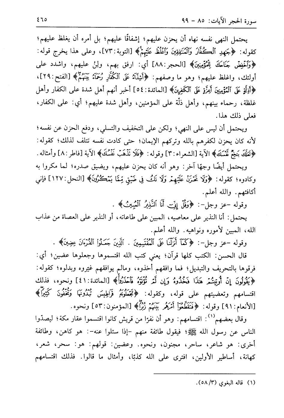 وقَالَ بَعْضُهُمْ: اقتسامهم: وهو أن نفرًا من قريش كانوا اقتسموا عقار مكة؛ ليصدّوا الناس عن رسول اللَّه - صَلَّى اللَّهُ عَلَيهِ وَسَلَّمَ -؛ فيقول طائفة منهم - إذا سئلوا عنه -: هو كاهن، وطائفة أخرى: هو شاعر، ساحر، مجنون، ونحوه. وعضين: قولهم: هو: سحر، شعر، كهانة، أساطير الأولين، افترى على اللَّه كذبًا، وأمثال ما قالوا. فذلك اقتسامهم