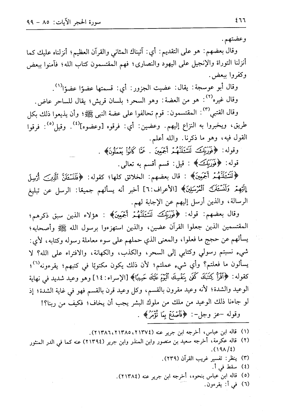 وقَالَ الْقُتَبِيُّ: المقتسمون: قوم تحالفوا على عضة النبي - صَلَّى اللَّهُ عَلَيهِ وَسَلَّمَ -؛ وأن يذيعوا ذلك بكل طريق، ويخبروا به النزاع إليهم. وعضين: أي: فرقوه وعضوه. وقيل: فرقوا القول فيه، وهو ما ذكرنا. واللَّه أعلم.