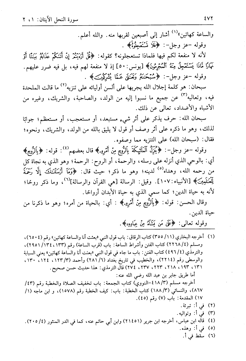 وقوله - عَزَّ وَجَلَّ -: (يُنَزِّلُ الْمَلَائِكَةَ بِالرُّوحِ مِنْ أَمْرِهِ عَلَى مَنْ يَشَاءُ مِنْ عِبَادِهِ أَنْ أَنْذِرُوا أَنَّهُ لَا إِلَهَ إِلَّا أَنَا فَاتَّقُونِ (2) قَالَ بَعْضُهُمْ: قوله: (بِالرُّوحِ) أي: بالوحي الذي أنزله على رسله، والرحمة، أو الروح: الرحمة؛ وهو الذي به نجاة كل من رحمه اللَّه، وهداه لدينه؛ وهو ما ذكر؛ حيث قال: (وَمَا أَرْسَلْنَاكَ إِلَّا رَحْمَةً لِلْعَالَمِينَ). وقيل: الرسالة أهي القرآن والرسالة، وما ذكر روحًا؛ لأنه به حياة الدِّين؛ كما سمي الذي به حياة الأبدان أرواحًا.