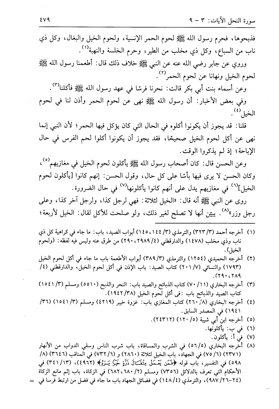 فذبحوها، فحرم رسول اللَّه - صَلَّى اللَّهُ عَلَيهِ وَسَلَّمَ - لحوم الحمر الإنسية، ولحوم الخيل والبغال، وكل ذي ناب من السباع، وكل ذي مخلب من الطير، وحرم الخلسة والنهبة.