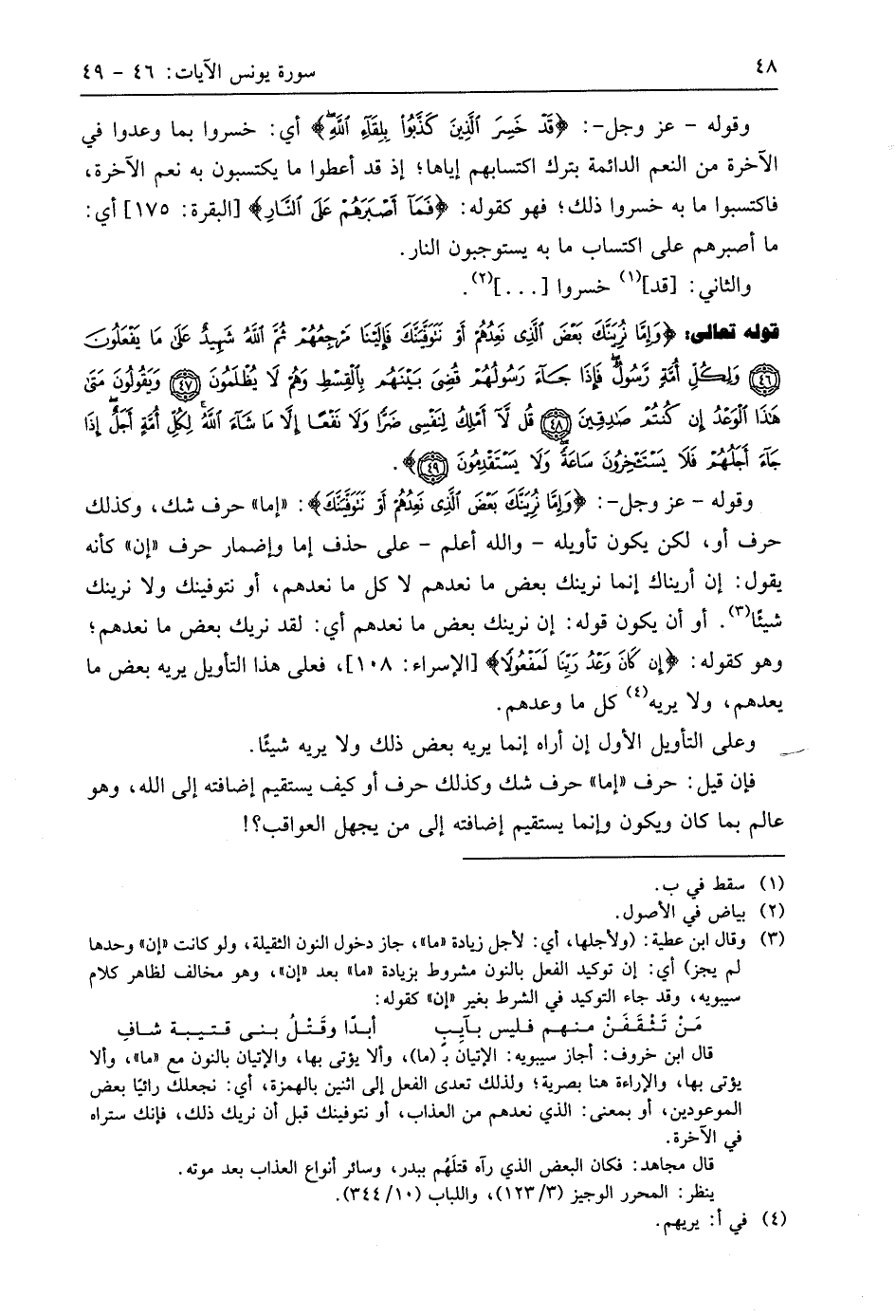 وقوله - عَزَّ وَجَلَّ -: (وَإِمَّا نُرِيَنَّكَ بَعْضَ الَّذِي نَعِدُهُمْ أَوْ نَتَوَفَّيَنَّكَ): " إما " حرف شك، وكذلك حرف ولكن يكون تأويله - واللَّه أعلم - على حذف إما وإضمار حرف " إن " كأنه يقول: إن أريناك إنما نرينك بعض ما نعدهم لا كل ما نعدهم، أو نتوفينك ولا نرينك شيئا. أو أن يكون قوله: إن نرينك بعض ما نعدهم أي: لقد نريك بعض ما نعدهم؛ وهو كقوله: (إِنْ كَانَ وَعْدُ رَبِّنَا لَمَفْعُولًا)، فعلى هذا التأويل يريه بعض ما لعدهم، ولا يريه كل ما وعدهم.
