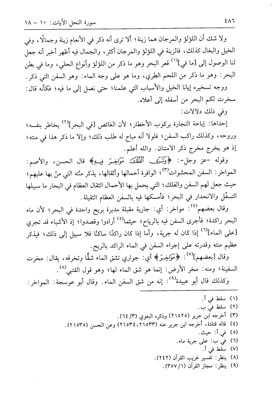 وقَالَ بَعْضُهُمْ: مواخر: أي: جارية مقبلة مدبرة بريح واحدة في البحر؛ لأن ماء البحر راكدة؛ فأجرى السفن فيه بالرياح؛ حيثما أرادوا وقصدوا؛ إذ الأشياء قد تجري على الماء، إذا كان له جرية، وأما إذا كان راكدًا ساكنًا فلا سبيل إلى ذلك؛ فيذكر عظيم منته وقدرته على إجراء السفن في الماء الراكد بالريح.