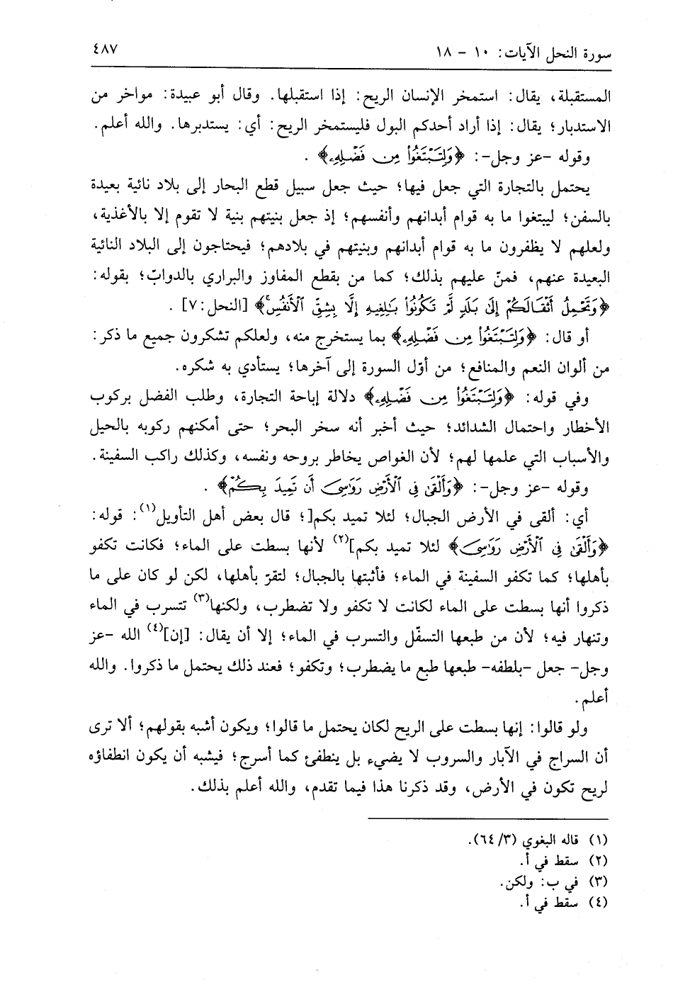 يحتمل بالتجارة التي جعل فيها؛ حيث جعل سبيل قطع البحار إلى بلاد نائية بعيدة بالسفن؛ ليبتغوا ما به قوام أبدانهم وأنفسهم؛ إذ جعل بنيتهم بنية لا تقوم إلا بالأغذية، ولعلهم لا يظفرون ما به قوام أبدانهم وبنيتهم في بلادهم؛ فيحتاجون إلى البلاد النائية البعيدة عنهم، فمنَّ عليهم بذلك؛ كما من بقطع المفاوز والبراري بالدواب؛ بقوله: (وَتَحْمِلُ أَثْقَالَكُمْ إِلَى بَلَدٍ لَمْ تَكُونُوا بَالِغِيهِ إِلَّا بِشِقِّ الْأَنْفُسِ).