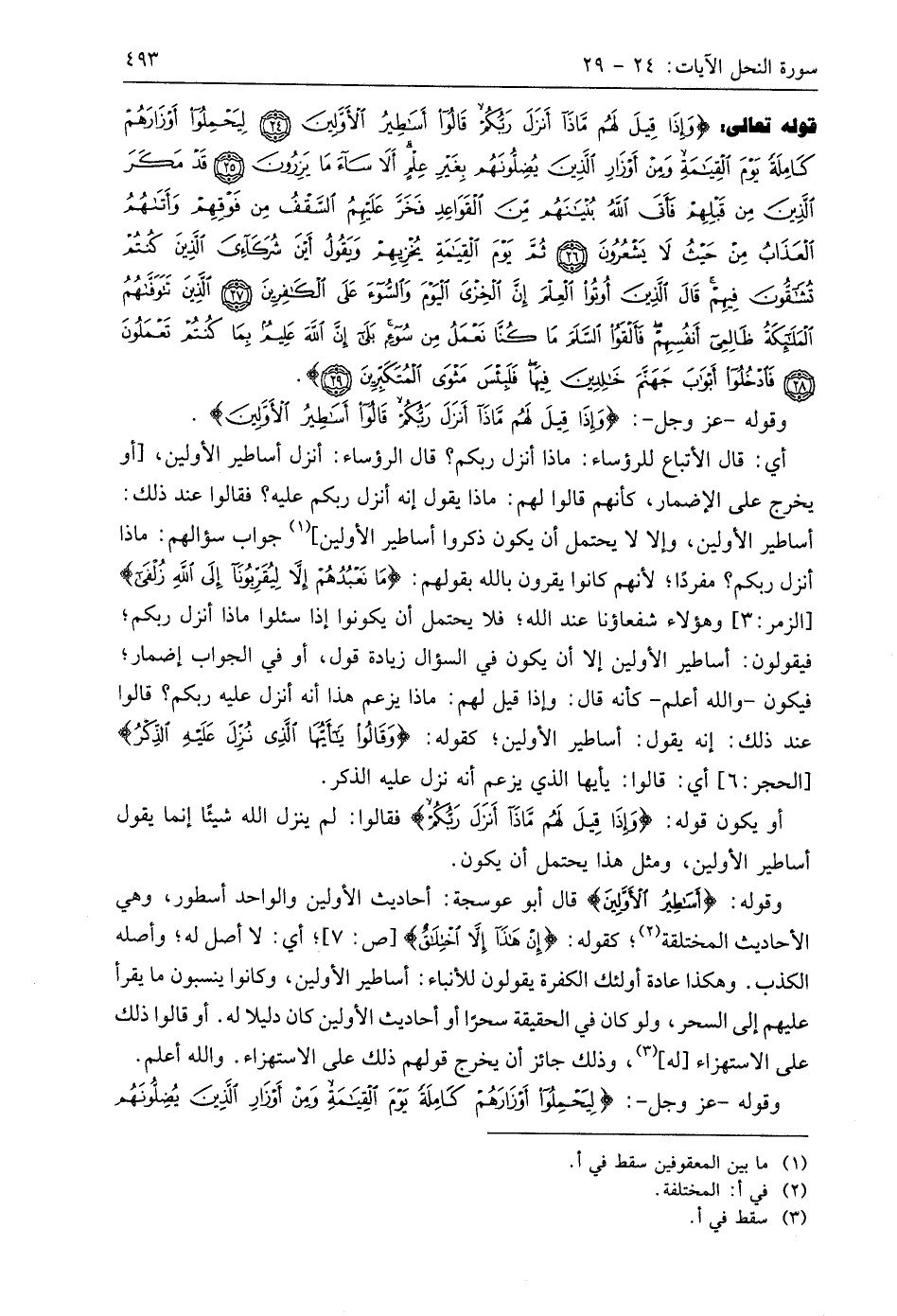 وقوله - عَزَّ وَجَلَّ -: (وَإِذَا قِيلَ لَهُمْ مَاذَا أَنْزَلَ رَبُّكُمْ قَالُوا أَسَاطِيرُ الْأَوَّلِينَ).