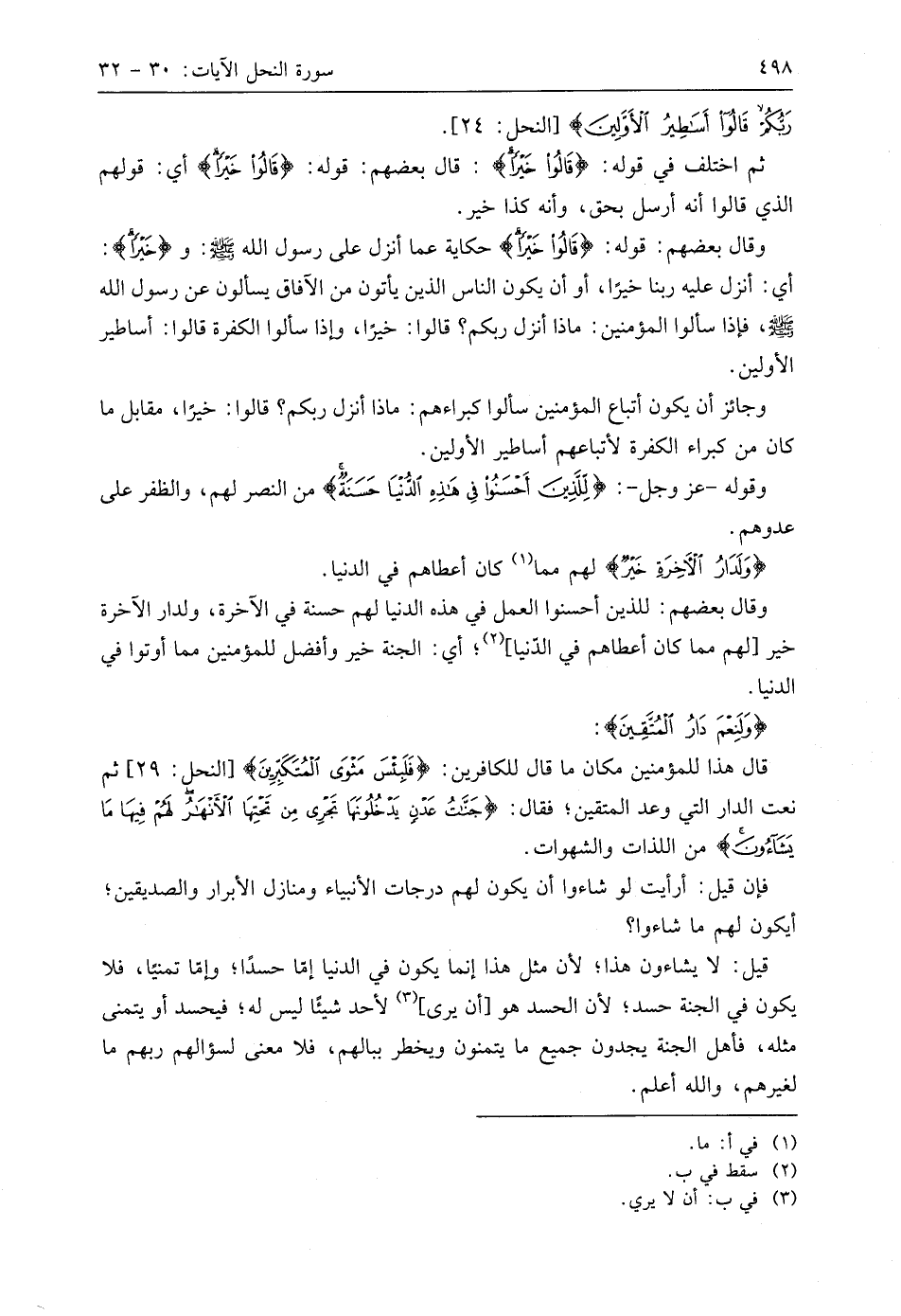 وقَالَ بَعْضُهُمْ: قوله: (قَالُوا خَيْرًا) حكاية عما أنزل على رسول اللَّه عصم: و (خَيْرًا): أي: أنزل عليه ربنا خيرًا، أو أن يكون الناس الذين يأتون من الآفاق يسألون عن رسول الله - صَلَّى اللَّهُ عَلَيهِ وَسَلَّمَ - فإذا سألوا المؤمنين: ماذا أنزل ربكم؟ قالوا: خيرًا، وإذا سألوا الكفرة قالوا: أساطير الأولين.