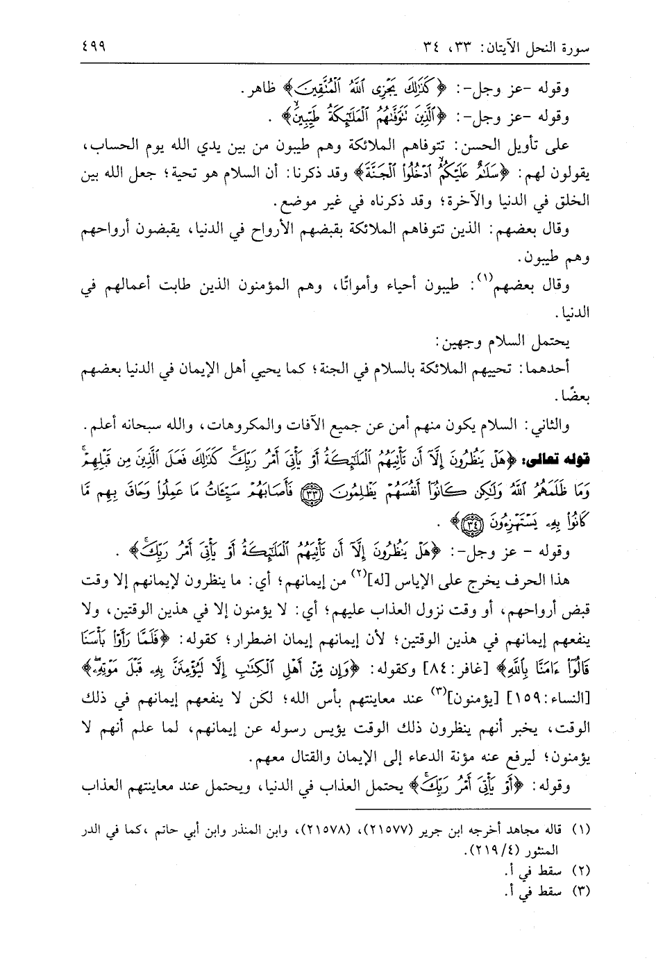 وقوله - عَزَّ وَجَلَّ -: (الَّذِينَ تَتَوَفَّاهُمُ الْمَلَائِكَةُ طَيِّبِينَ يَقُولُونَ سَلَامٌ عَلَيْكُمُ ادْخُلُوا الْجَنَّةَ بِمَا كُنْتُمْ تَعْمَلُونَ (32)