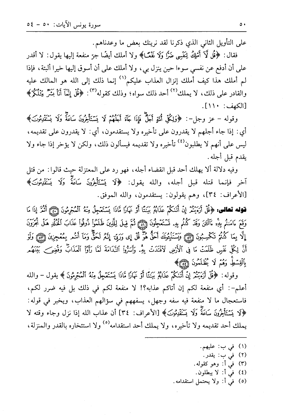 فقال: (قُلْ لَا أَمْلِكُ لِنَفْسِي ضَرًّا وَلَا نَفْعًا إِلَّا مَا شَاءَ اللَّهُ لِكُلِّ أُمَّةٍ أَجَلٌ إِذَا جَاءَ أَجَلُهُمْ فَلَا يَسْتَأْخِرُونَ سَاعَةً وَلَا يَسْتَقْدِمُونَ (49) ولا أملك أيضا جز منفعة إليها يقول: لا أقدر على أن أدفع عن نفسي سوءا حين ينزل بي، ولا أملك على أن أسوق إليها خيرا ألبتَّة، فإذا لم أملك هذا كيف أملك إنزال العذاب عليكم إنما ذلك إلى اللَّه هو المالك عليه والقادر على ذلك، لا يملك أحد ذلك سواه؛ وذلك كقوله: (قُلْ إِنَّمَا أَنَا بَشَرٌ مِثْلُكُمْ).