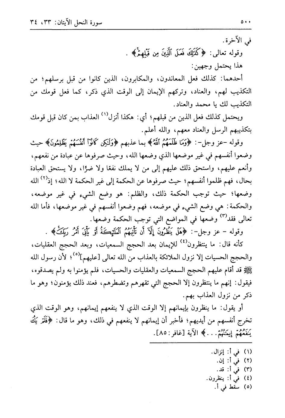كأنه قال: ما ينتظرون للإيمان بعد الحجج السمعيات، وبعد الحجج العقليات، والحجج الحسيات إلا نزول الملائكة بالعذاب من اللَّه تعالى عليهم؛ لأن رسول الله - صَلَّى اللَّهُ عَلَيهِ وَسَلَّمَ - قد أقام عليهم الحجج السمعيات والعقليات والحسيات، فلم يؤمنوا به ولم يصدقوه، فيقول: إنهم ما ينتظرون إلا الحجج التي تقهرهم وتضطرهم، فعند ذلك يؤمنون؛ وهو ما ذكر من نزول العذاب بهم.