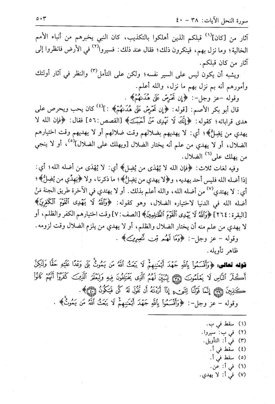 وقوله - عَزَّ وَجَلَّ -: (إِنْ تَحْرِصْ عَلَى هُدَاهُمْ فَإِنَّ اللَّهَ لَا يَهْدِي مَنْ يُضِلُّ وَمَا لَهُمْ مِنْ نَاصِرِينَ (37)