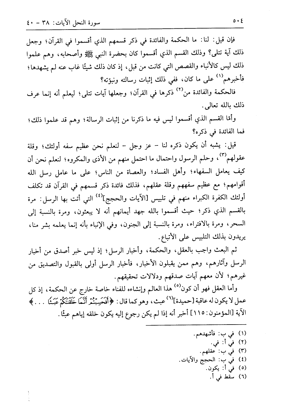 قيل: يشبه أن يكون ذكره لنا - عَزَّ وَجَلَّ - لنعلم نحن عظيم سفه أُولَئِكَ؛ وقلة عقولهم، وحلم الرسول واحتمال ما احتمل منهم من الأذى والمكروه؛ لنعلم نحن أن كيف يعامل السفهاء؛ وأهل الفساد؛ والعصاة من الناس؛ على ما عامل رسل الله أقوامهم؛ مع عظيم سفههم وقلة عقلهم، فذلك فائدة ذكر قسمهم في القرآن قد تكلف أُولَئِكَ الكفرة الكبراء منهم في تلبيس الآيات والحجج، التي أتت بها الرسل: مرة بالقسم الذي ذكر؛ حيث أقسموا باللَّه جهد أيمانهم أنه لا يبعثون، ومرة بالنسبة إلى السحر، ومرة بالافتراء، ومرة بالنسبة إلى الجنون، وفي الإنباء بأنه إنما يعلمه بشر منا، يريدون بذلك التلبيس على الأتباع.