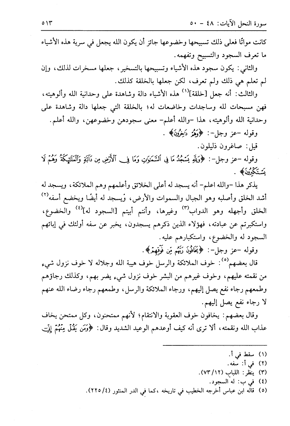 وقوله - عَزَّ وَجَلَّ -: (وَلِلَّهِ يَسْجُدُ مَا فِي السَّمَاوَاتِ وَمَا فِي الْأَرْضِ مِنْ دَابَّةٍ وَالْمَلَائِكَةُ وَهُمْ لَا يَسْتَكْبِرُونَ (49)