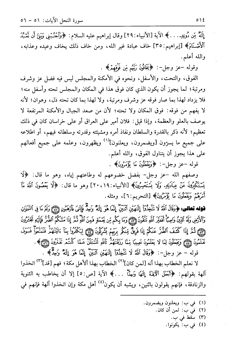 قوله تعالى: (وَقَالَ اللَّهُ لَا تَتَّخِذُوا إِلَهَيْنِ اثْنَيْنِ إِنَّمَا هُوَ إِلَهٌ وَاحِدٌ فَإِيَّايَ فَارْهَبُونِ (51) وَلَهُ مَا فِي السَّمَاوَاتِ وَالْأَرْضِ وَلَهُ الدِّينُ وَاصِبًا أَفَغَيْرَ اللَّهِ تَتَّقُونَ (52) وَمَا بِكُمْ مِنْ نِعْمَةٍ فَمِنَ اللَّهِ ثُمَّ إِذَا مَسَّكُمُ الضُّرُّ فَإِلَيْهِ تَجْأَرُونَ (53) ثُمَّ إِذَا كَشَفَ الضُّرَّ عَنْكُمْ إِذَا فَرِيقٌ مِنْكُمْ بِرَبِّهِمْ يُشْرِكُونَ (54) لِيَكْفُرُوا بِمَا آتَيْنَاهُمْ فَتَمَتَّعُوا فَسَوْفَ تَعْلَمُونَ (55) وَيَجْعَلُونَ لِمَا لَا يَعْلَمُونَ نَصِيبًا مِمَّا رَزَقْنَاهُمْ تَاللَّهِ لَتُسْأَلُنَّ عَمَّا كُنْتُمْ تَفْتَرُونَ (56)