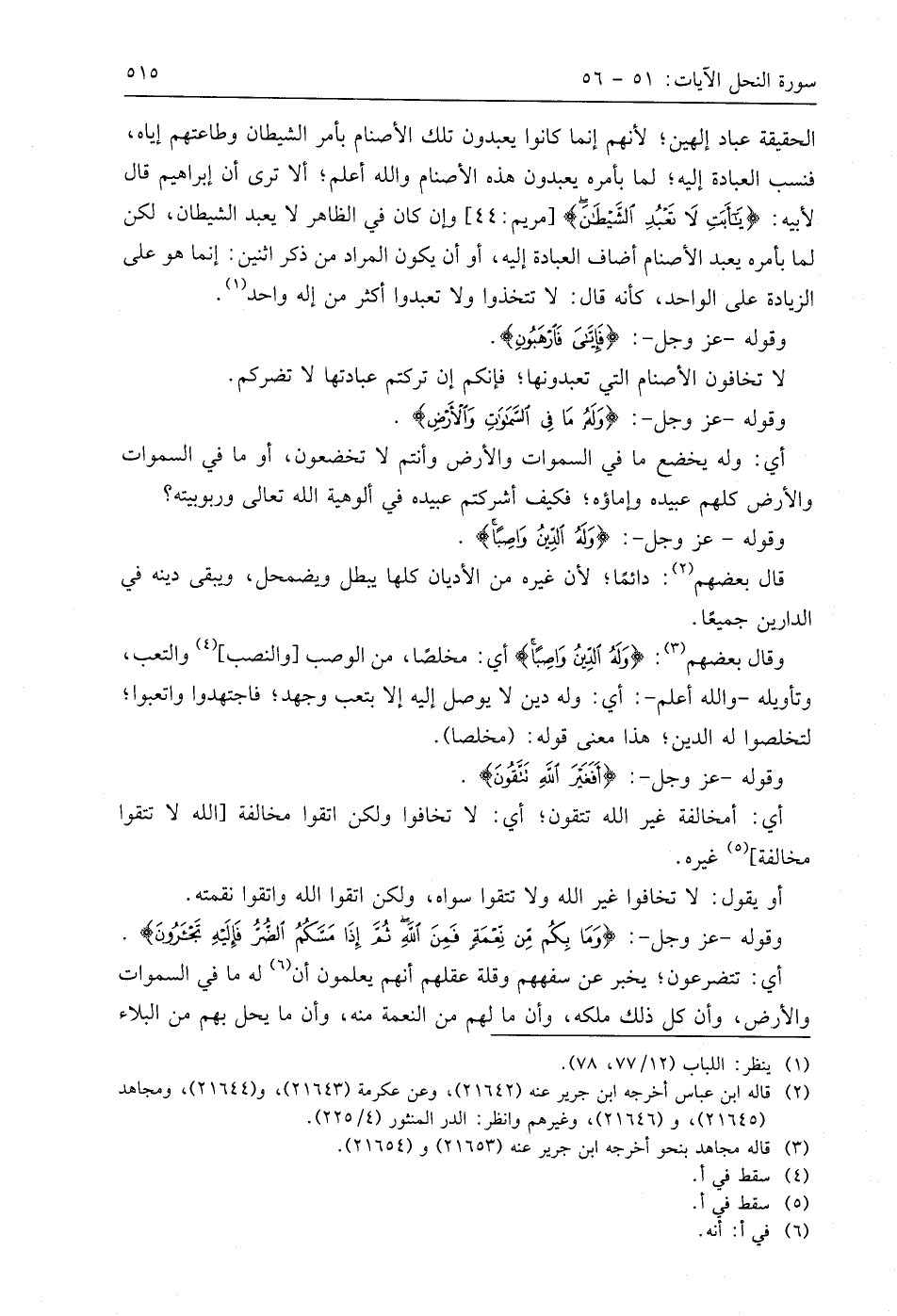 وقوله - عَزَّ وَجَلَّ -: (وَلَهُ مَا فِي السَّمَاوَاتِ وَالْأَرْضِ وَلَهُ الدِّينُ وَاصِبًا أَفَغَيْرَ اللَّهِ تَتَّقُونَ (52)