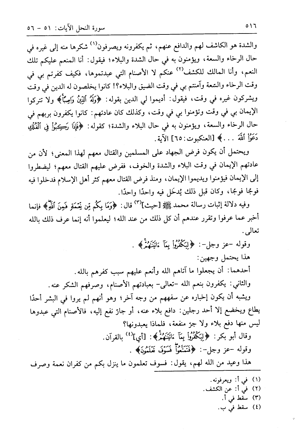 والشدة هو الكاشف لهم والدافع عنهم، ثم يكفرونه ويصرفون شكرها منه إلى غيره في حال الرخاء والسعة، ويؤمنون به في حال الشدة والبلاء؛ فيقول: أنا المنعم عليكم تلك النعم، وأنا المالك للكشف عنكم لا الأصنام التي عبدتموها، فكيف كفرتم بي في وقت الرخاء والسعة وآمنتم بي في وقت الضيق والبلاء؟! كانوا يخلصون له الدِّين في وقت ويشركون غيره في وقت، فيقول: أديموا لي الدِّين بقوله: (وَلَهُ الدِّينُ وَاصِبً) ولا تتركوا الإيمان بي في وقت وتؤمنوا بي في وقت، وكذلك كان عادتهم: كانوا يكفرون بربهم في حال الرخاء والسعة، ويؤمنون به في حال البلاء والشدة؛ كقوله: (فَإِذَا رَكِبُوا فِي الْفُلْكِ دَعَوُا اللَّهَ. . .) الآية.
