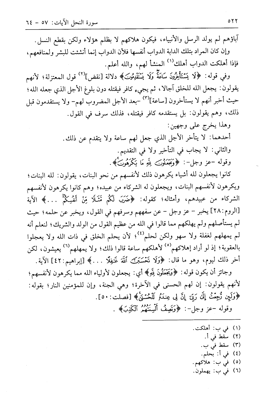 وفي قوله: (لَا يَسْتَأْخِرُونَ سَاعَةً وَلَا يَسْتَقْدِمُونَ) دلالة نقض قول المعتزلة؛ لأنهم يقولون: يجعل اللَّه للخلق آجالا، ثم يجيء كافر فيقتله دون بلوغ الأجل الذي جعله اللَّه؛ حيث أخبر أنهم لا يستأخرون ساعة - بعد الأجل المضروب لهم - ولا يستقدمون قبل ذلك، وهم يقولون: بل يستقدمه كافر فيقتله، فذلك سرف في القول.