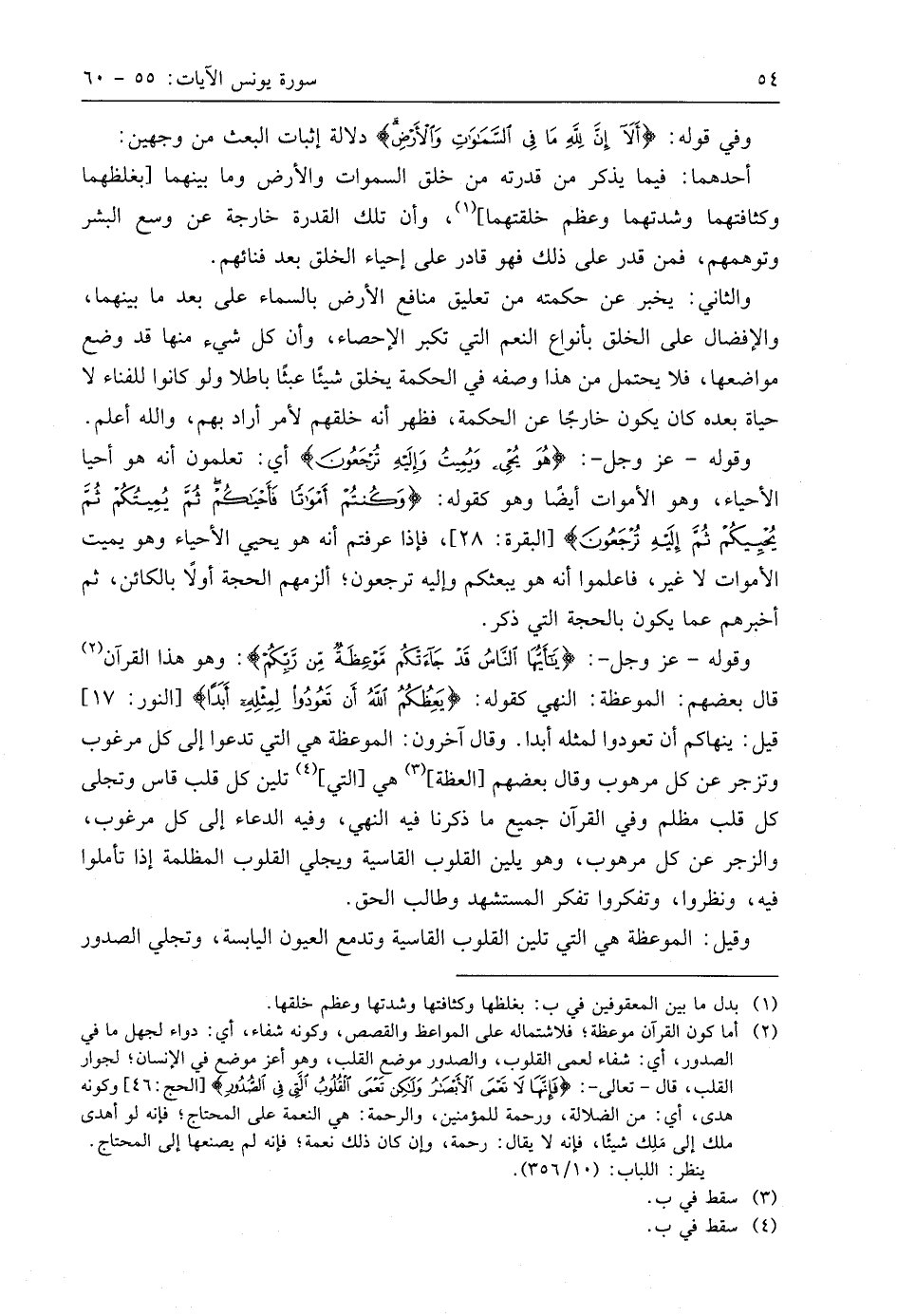 وقوله - عَزَّ وَجَلَّ -: (يَا أَيُّهَا النَّاسُ قَدْ جَاءَتْكُمْ مَوْعِظَةٌ مِنْ رَبِّكُمْ وَشِفَاءٌ لِمَا فِي الصُّدُورِ وَهُدًى وَرَحْمَةٌ لِلْمُؤْمِنِينَ (57) وهو هذا القرآن قَالَ بَعْضُهُمْ: الموعظة: النهي كقوله: (يَعِظُكُمُ اللَّهُ أَنْ تَعُودُوا لِمِثْلِهِ أَبَدًا)، قيل: ينهاكم أن تعودوا لمثله أبدا. وقال آخرون: الموعظة هي التي تدعوا إلى كل مرغوب وتزجر عن كل مرهوب وقَالَ بَعْضُهُمْ العظة هي التي تلين كل قلب قاس وتجلي كل قلب مظلم وفي القرآن جميع ما ذكرنا فيه النهي، وفيه الدعاء إلى كل مرغوب، والزجر عن كل مرهوب، وهو يلين القلوب القاسية ويجلي القلوب المظلمة إذا تأملوا فيه، ونظروا، وتفكروا تفكر المستشهد وطالب الحق.