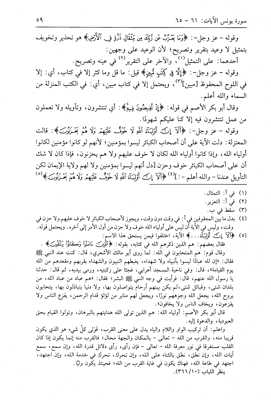 وقوله - عَزَّ وَجَلَّ -: (أَلَا إِنَّ أَوْلِيَاءَ اللَّهِ لَا خَوْفٌ عَلَيْهِمْ وَلَا هُمْ يَحْزَنُونَ (62) قالت المعتزلة: دلت الآية على أن أصحاب الكبائر ليسوا بمؤمنين؛ لأنهم لو كانوا مؤمنين لكانوا أولياء اللَّه، وإذا كانوا أولياء اللَّه لكان لا خوف عليهم ولا هم يحزنون، فإذا كان لا شك أن على أصحاب الكبائر خوف وحزن أدل أنهم ليسوا بمؤمنين ولا لهم ولاية الإيمان لكن التأويل عندنا - واللَّه أعلم -:، (أَلَا إِنَّ أَوْلِيَاءَ اللَّهِ لَا خَوْفٌ عَلَيْهِمْ وَلَا هُمْ يَحْزَنُونَ)