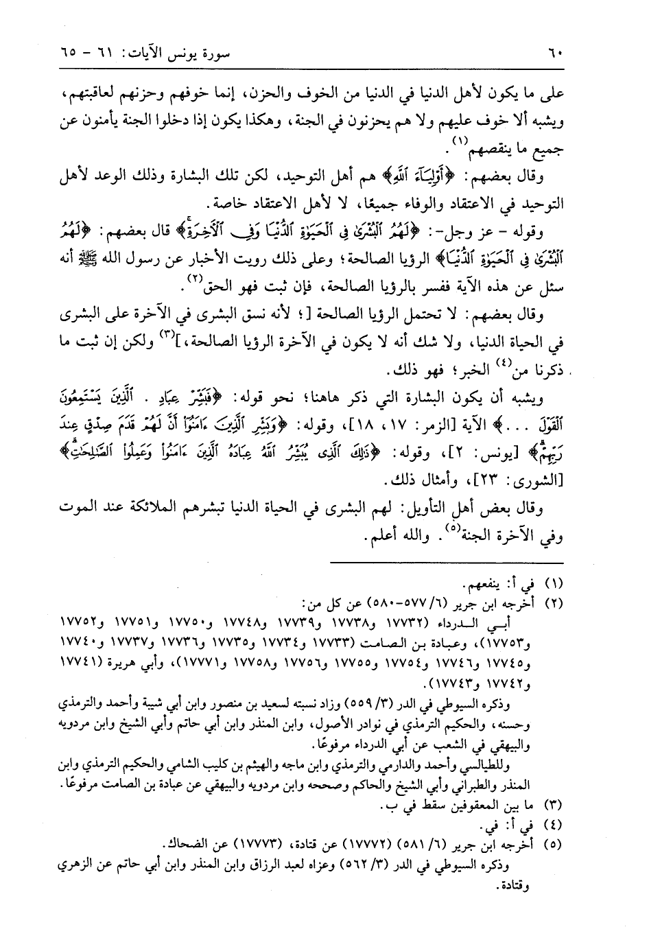 وقَالَ بَعْضُهُمْ: لا تحتمل الرؤيا الصالحة؛ لأنه نسق البشرى في الآخرة على البشرى في الحياة الدنيا، ولا شك أنه لا يكون في الآخرة الرؤيا الصالحة، ولكن إن ثبت ما ذكرنا من الخبر؛ فهو ذلك.