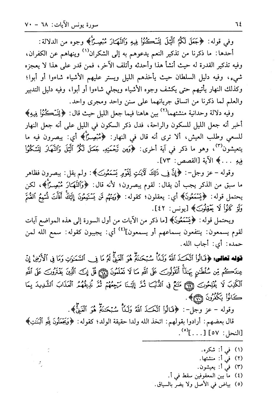 وقوله - عَزَّ وَجَلَّ -: (إِنَّ فِي ذَلِكَ لَآيَاتٍ لِقَوْمٍ يَسْمَعُونَ): ولم يقل: يبصرون فظاهر ما سبق من الذكر يجب أن يقال: لقوم يبصرون؛ لأنه قال: (وَالنَّهَارَ مُبْصِرًا)، لكن يحتمل قوله: (يَسْمَعُونَ) أي: يعقلون؛ كقوله: (وَمِنْهُمْ مَنْ يَسْتَمِعُونَ إِلَيْكَ أَفَأَنْتَ تُسْمِعُ الصُّمَّ وَلَوْ كَانُوا لَا يَعْقِلُونَ).